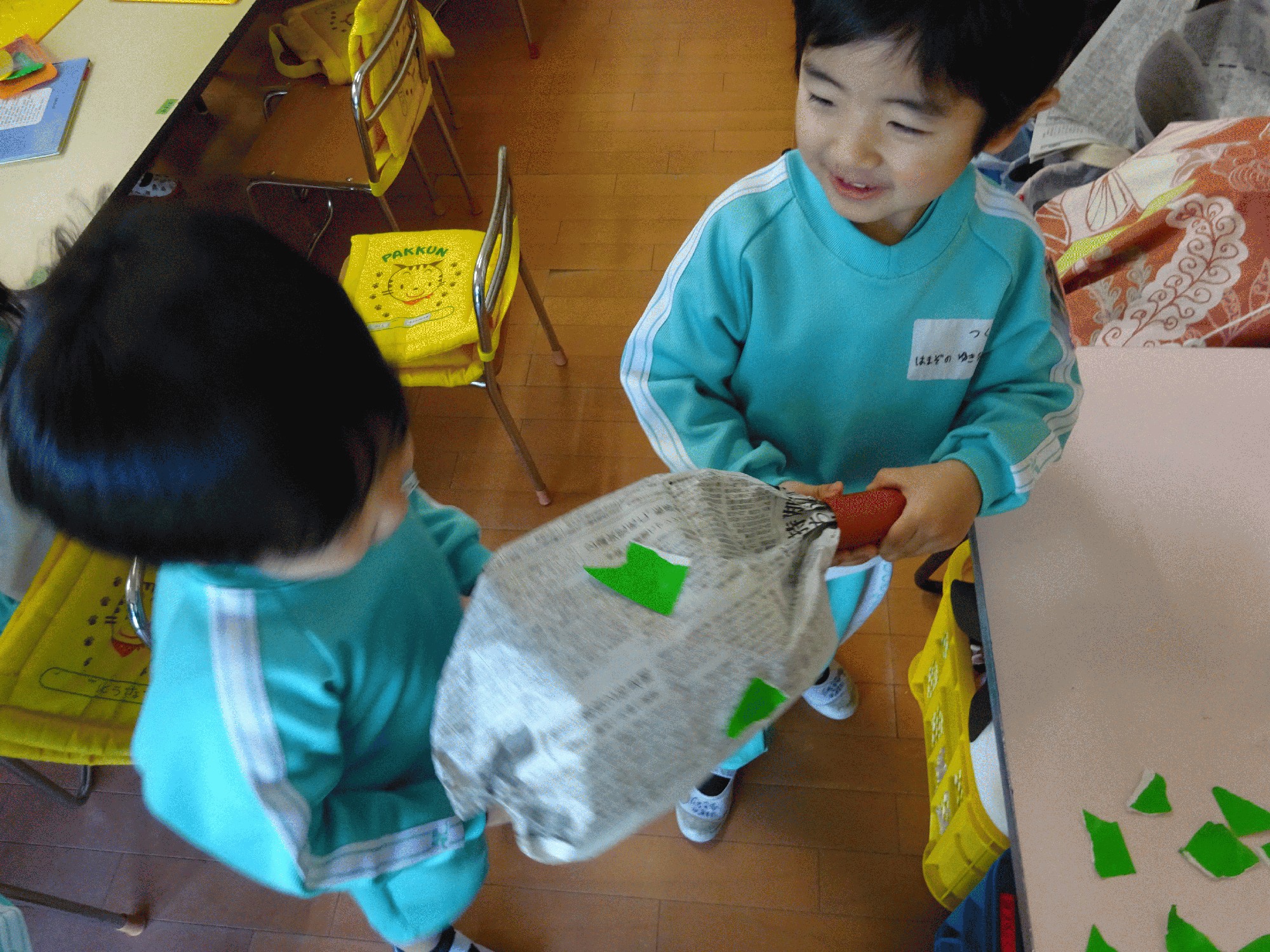 そしてつくし組でも今日は節分の「金棒」作りをしました。紙芝居で見た鬼が持っている金棒をトイレットペーパーの芯と新聞紙と折り紙で作りました。太っちょな金棒が出来たお友達は「なんだか、おいしそうなおにくにみえるね〜!」とお友達にモグモグ食べさせてあげているお友達もいましたよ(^^)