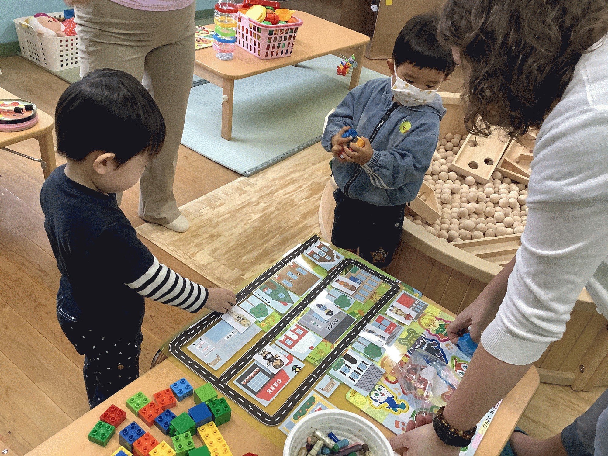 今日は、消防士さんのお仕事の絵本のあと、カフェや病院.消防署や学校と道路が描かれた地図みたいなシートに、磁石で そこで働く人の絵を貼ったり、ミニカーを道路に走らせたりして 遊びました♪
