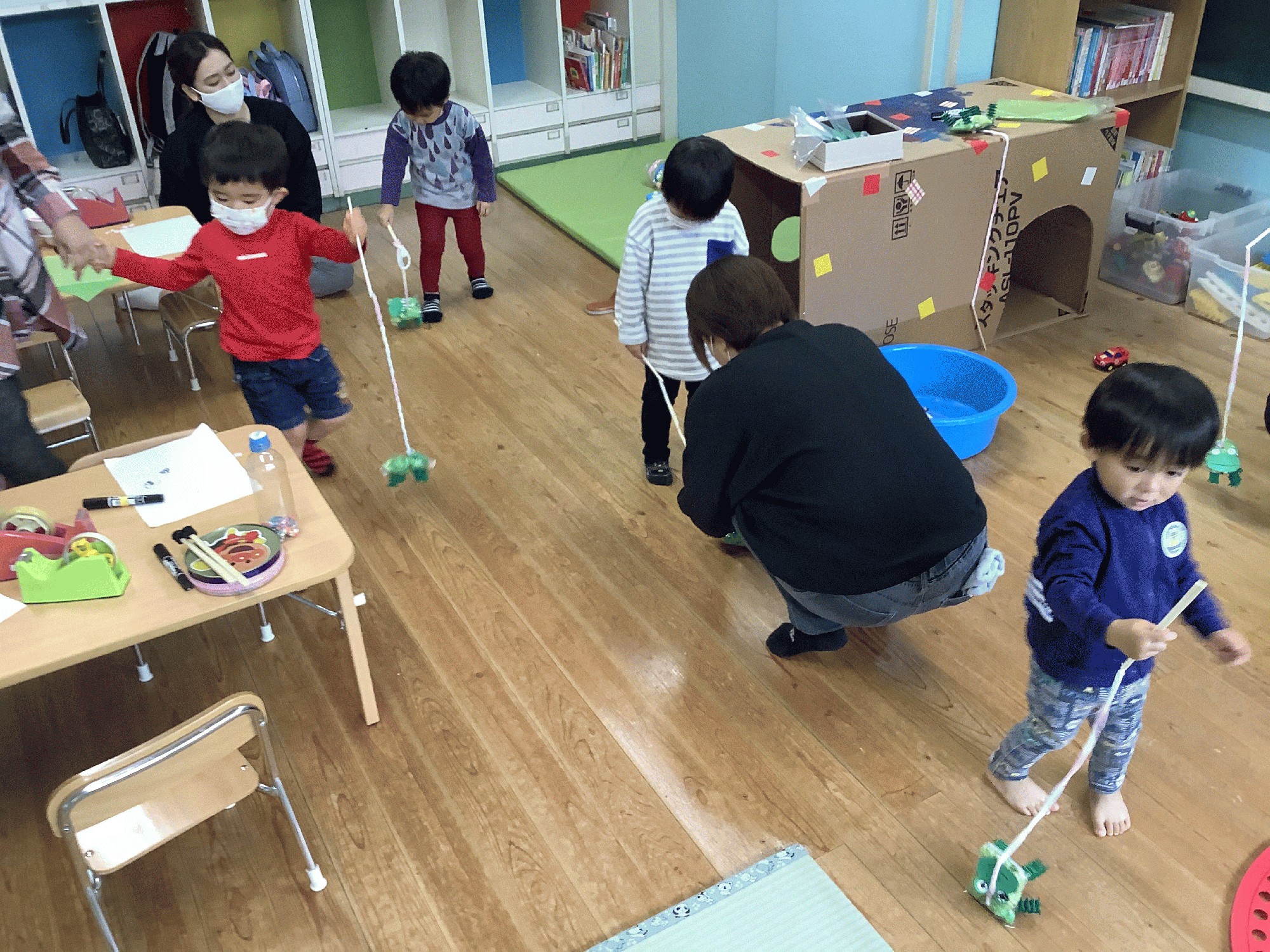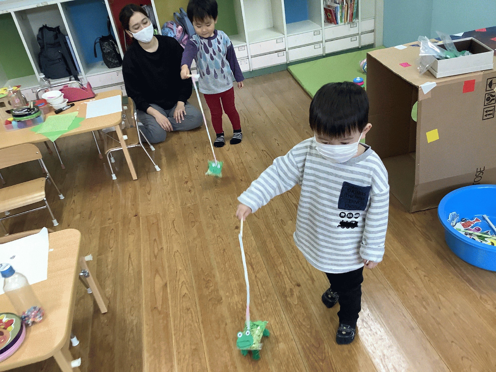 小さいポリ袋に緑色の桜紙をクシャクシャ丸めて詰めて、手足と顔を付けたら 可愛いカエルの出来上がり!割り箸に毛糸を付けて その先にカエルを貼り付けたら出来上がりです。顔も、みんな一生懸命太いマーカーを使って描いていました( ´ ▽ ` ) 出来上がったカエルを動かして お散歩したり追いかけっこしたり、楽しかったですね♫