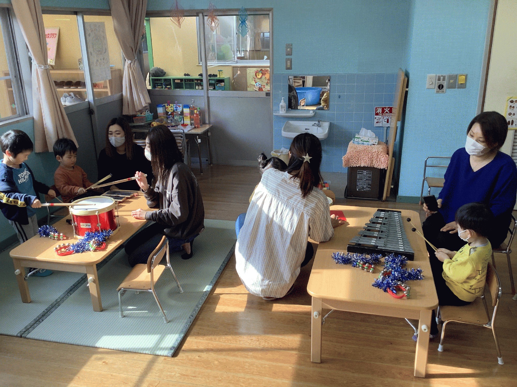 鈴.グロッケン.木琴.太鼓を出して、みんなで叩いたり鳴らして遊びました。ドンドン.りんりん….色んな音が音がして、初めて見る楽器に興味津々。最後は、カエルの歌に合わせて 自由に叩く事にもチャレンジしてみました♫