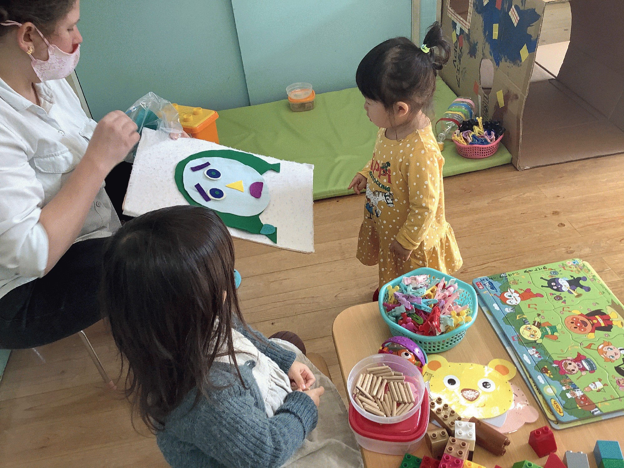 今日は、フェルトで福笑いのように 目や眉や口のパーツを貼って色んな表情を作りました! 笑った顔.悲しい顔.びっくりした顔…色んな顔が出来ましたね!(^^)