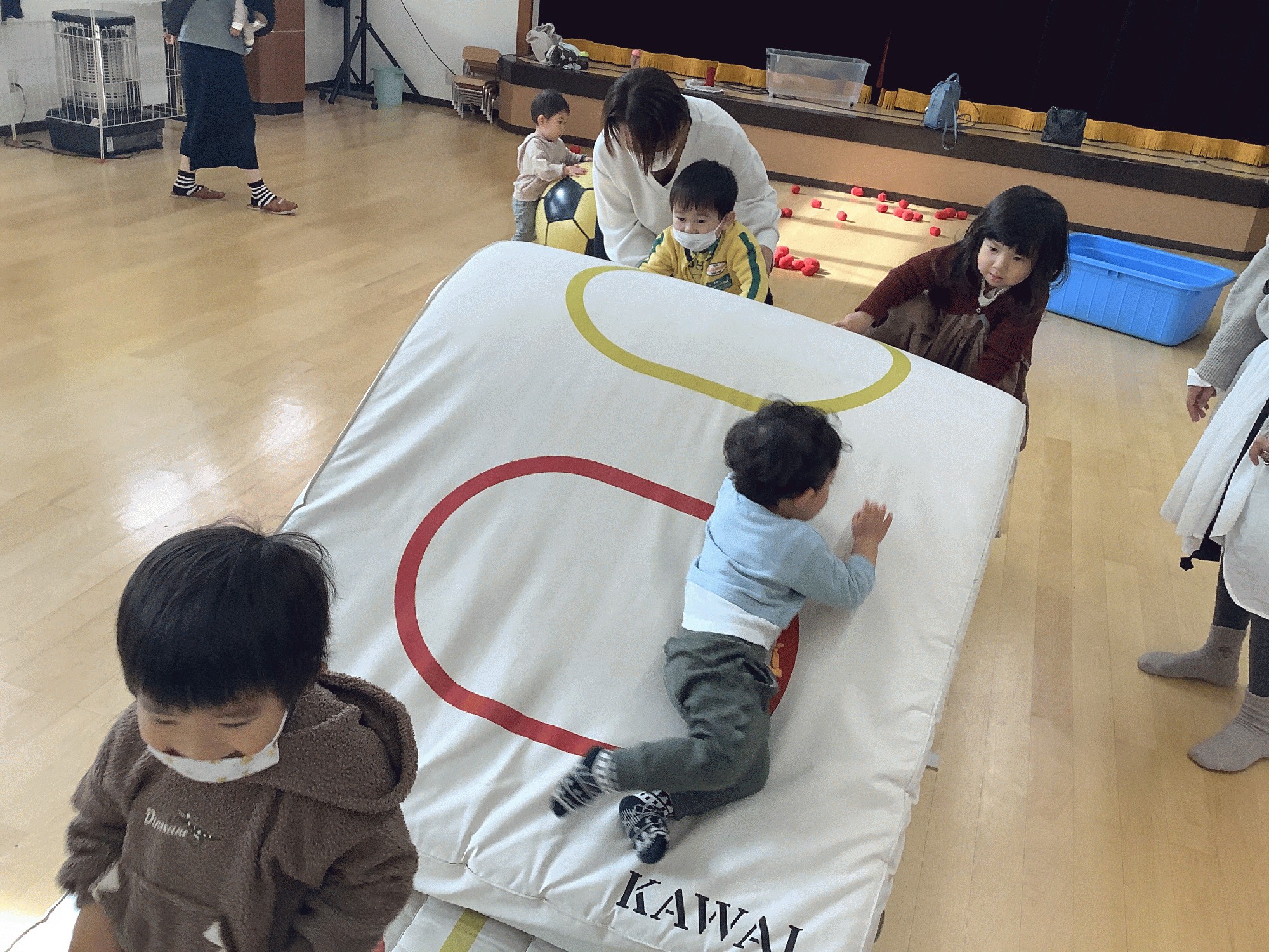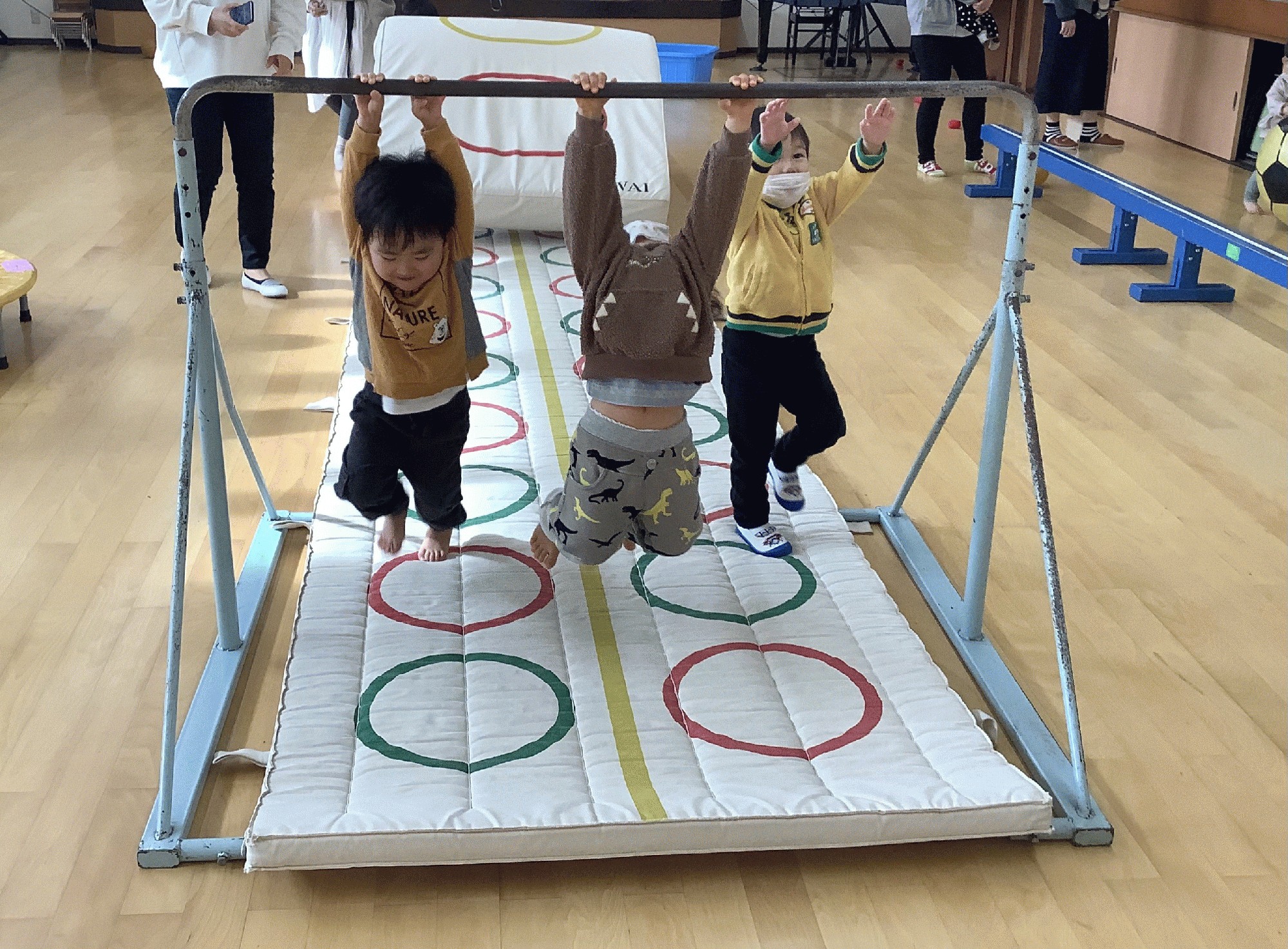 その後は、マットや跳び箱.平均台.トランポリン.鉄棒などを出して、登ったり 跳んだり 転がったり ぶら下がったり…おやつの時間も忘れて?目いっぱい遊びました‼(*^▽^*)