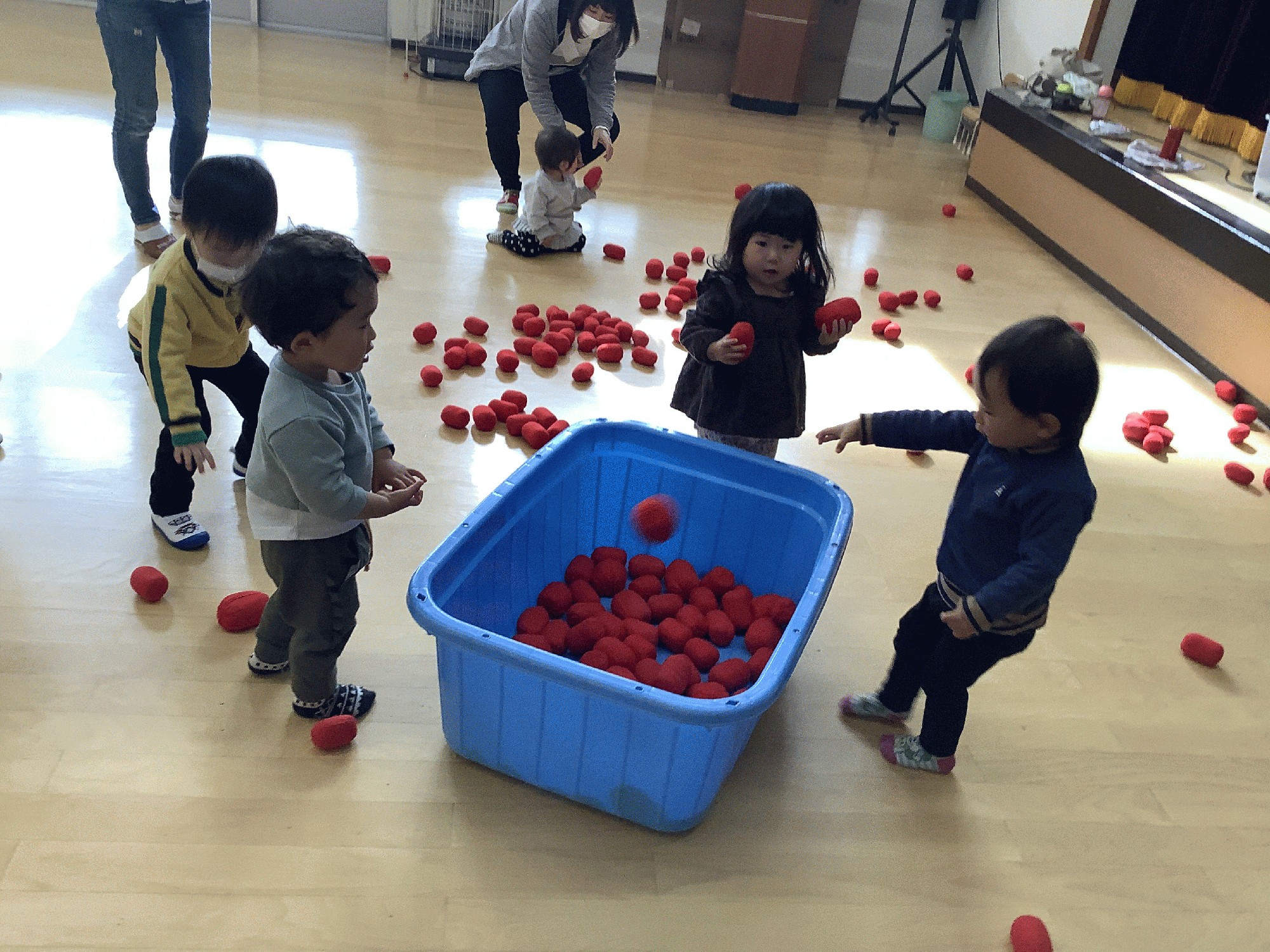 お顔を描いて プレゼントボックスにマスキングテープを貼ってかわいいサンタさんを作りました。それから、おゆうぎ室に移動して みんなでいっぱい体を動かしました! かけっこ遊び. それから 親子でメリーゴーラウンドとエビカニクスを元気に踊りました。