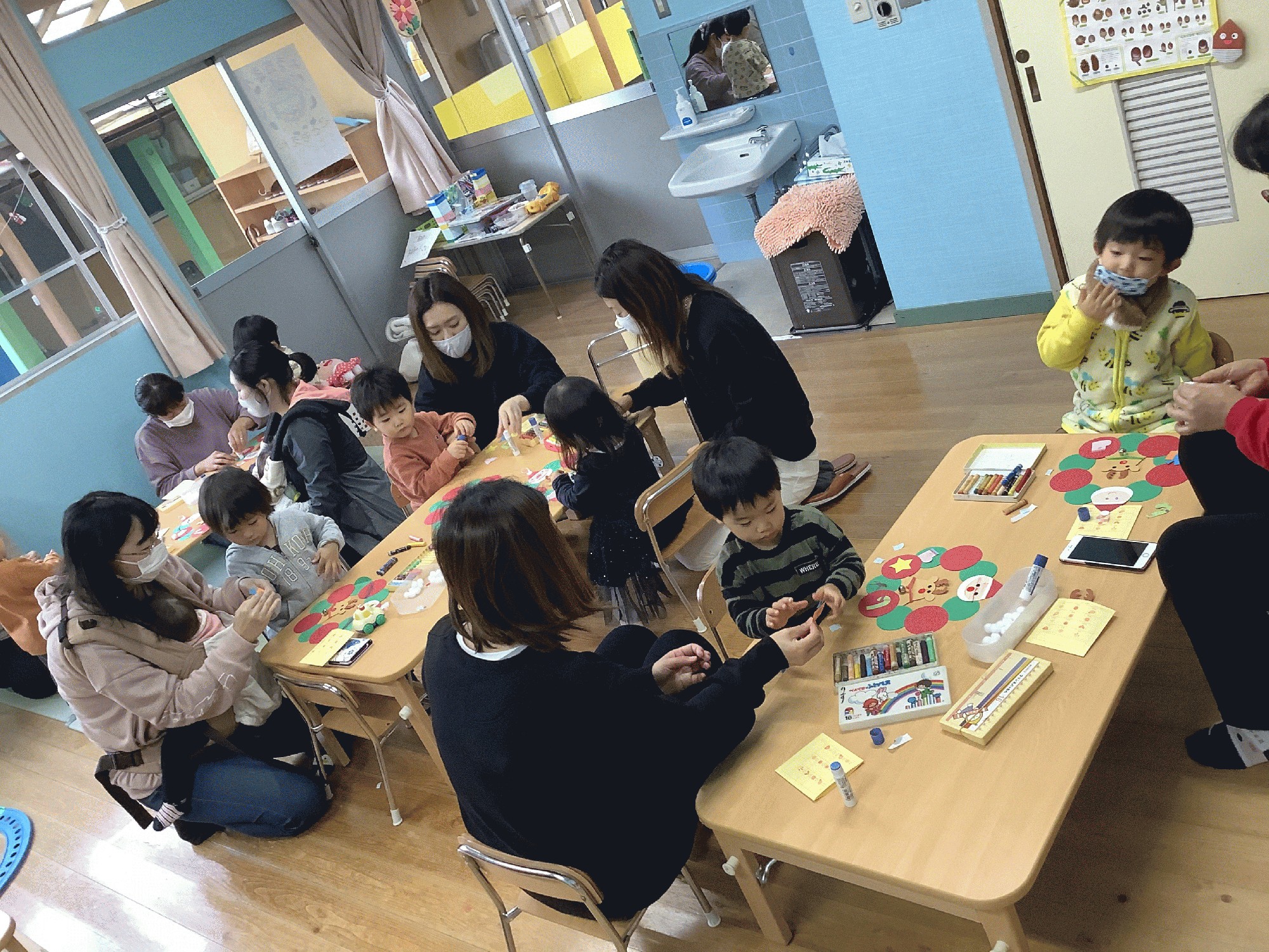 赤と緑の丸で作ったクリスマスカラーのリース。サンタさんの顔を描いたり、プレゼントボックスや星をのりで貼ったり、それから綿球を雪に見立てて ボンドで貼りました。割り箸に白いボンドを付けて貼る作業に 初めてのおともだちは 興味津々の様子でした。