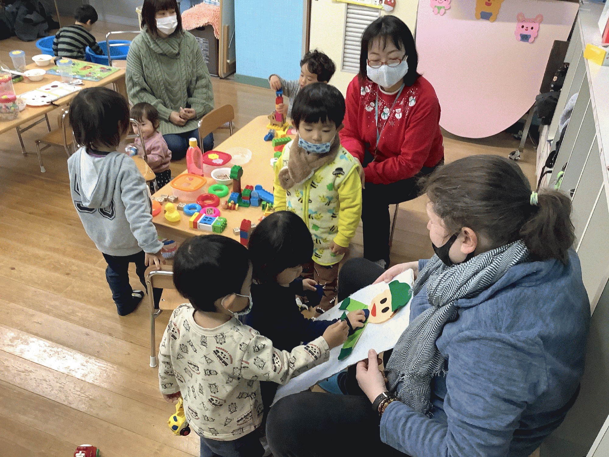 今日は雪の絵本を見たあと、ケイティ先生手作りのパネルで、男の子に 帽子.マフラーなど 雪の日の服装遠を着せました。ついついマフラーを足に付けてしまって、見ているママたちもニコニコでした( ´ ▽ ` )