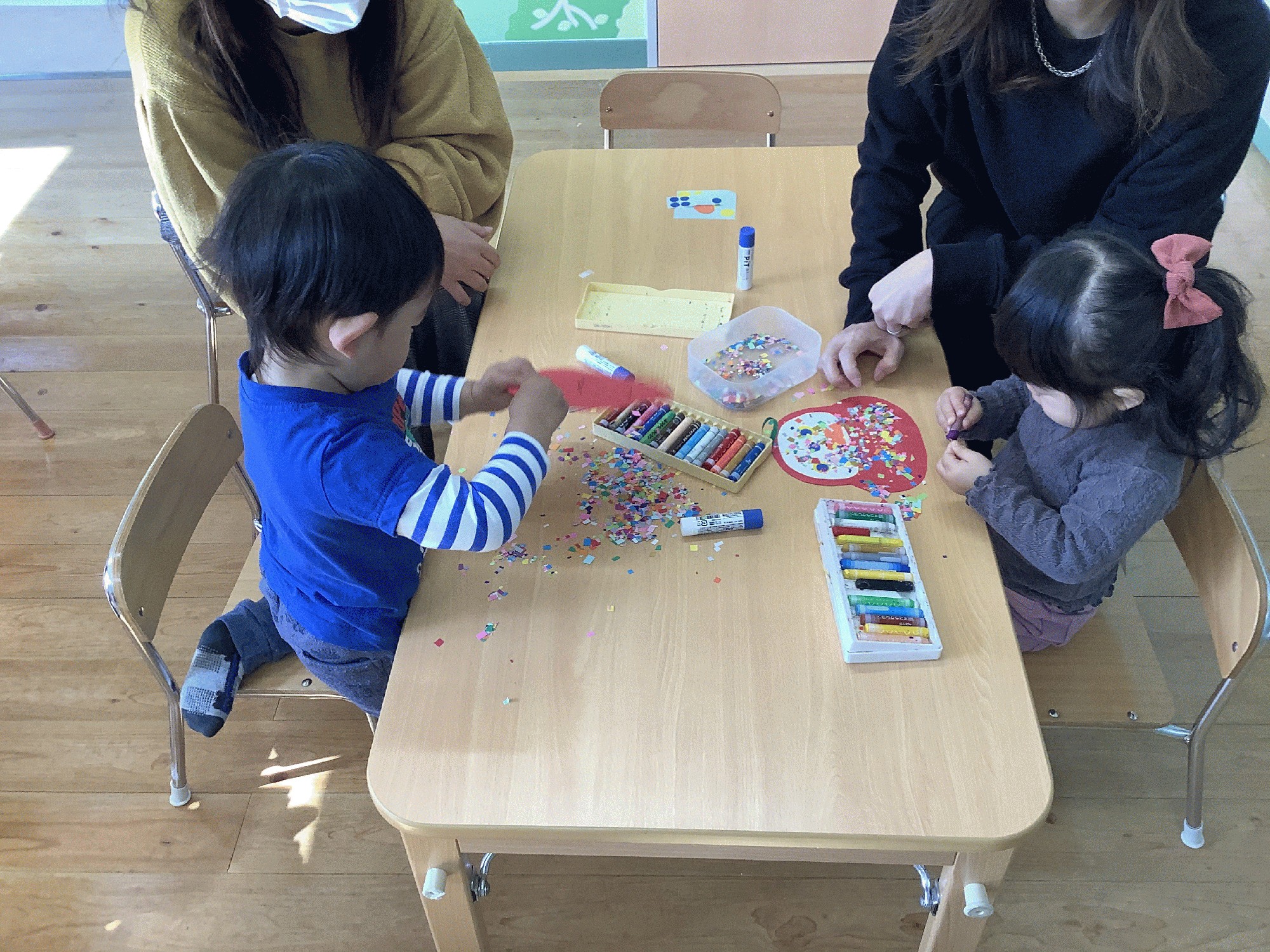 歌遊びとペープサートのあと、季節の制作で だるまさんを作りました。お顔はシールを貼ったりクレヨンで眉やお髭を描いたり…。体の部分には、のりを塗って細かく切った色画用紙をパラパラ〜とふりかけて おしゃれなだるまさんのかんせいです。