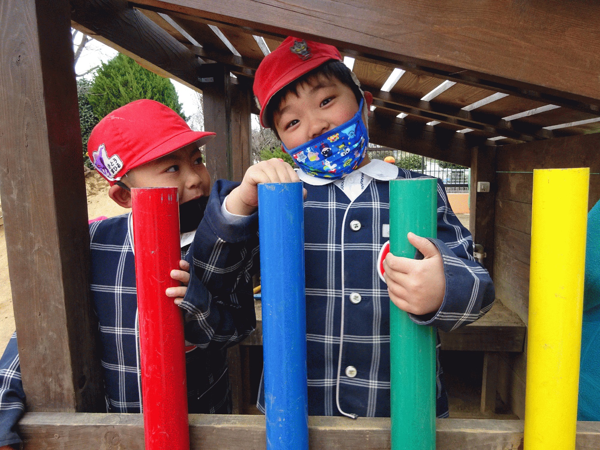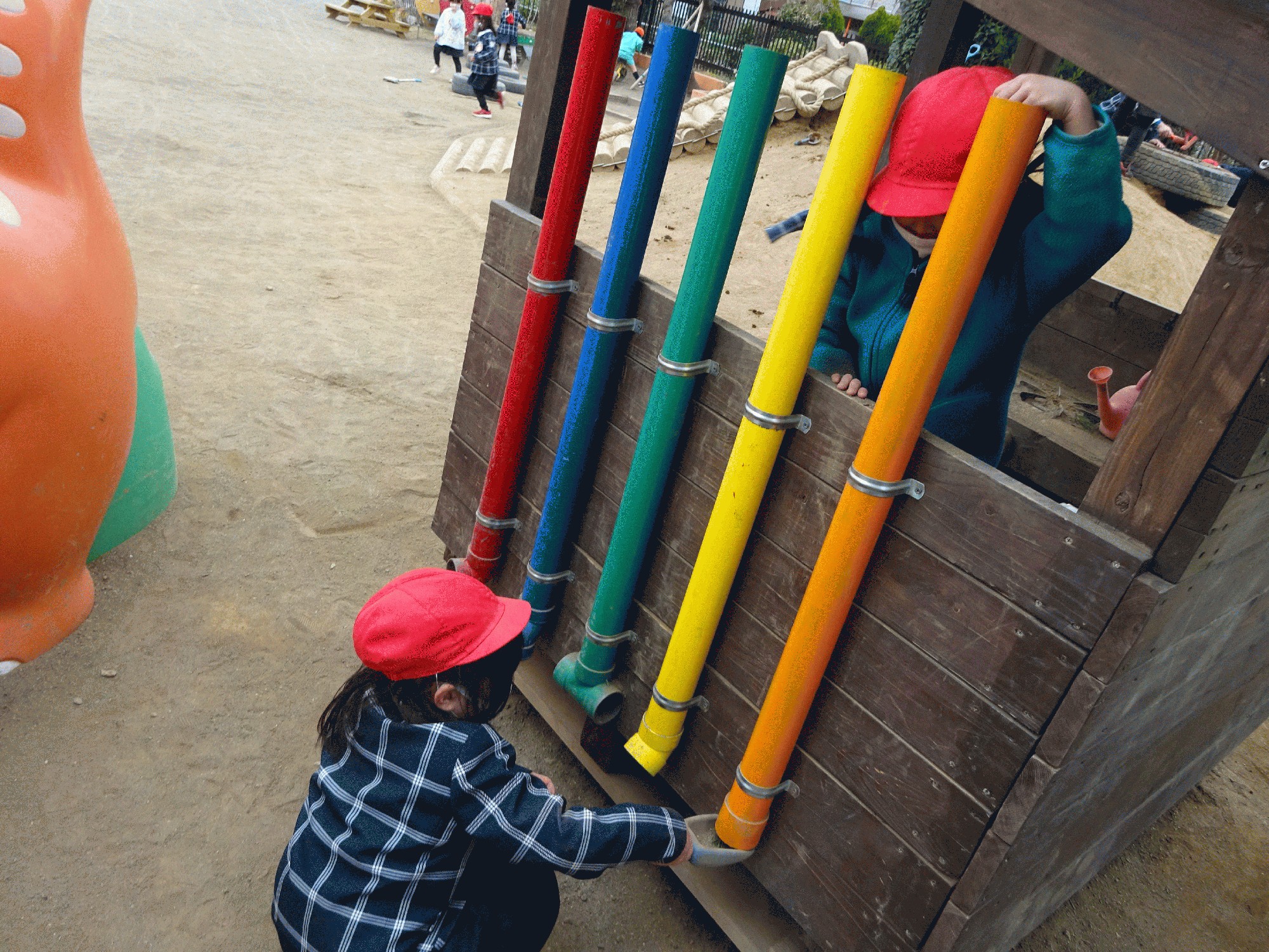 園庭で遊んでいる時のこと、山小屋の横にあるいろんな色の筒に砂や葉っぱを入れている子がいました。「何してるの〜?」と聞くと「これはジュース屋さんだよ!先生はオレンジジュースにする〜?」と言ってオレンジの筒を使ってドリンクバーをしていました☺