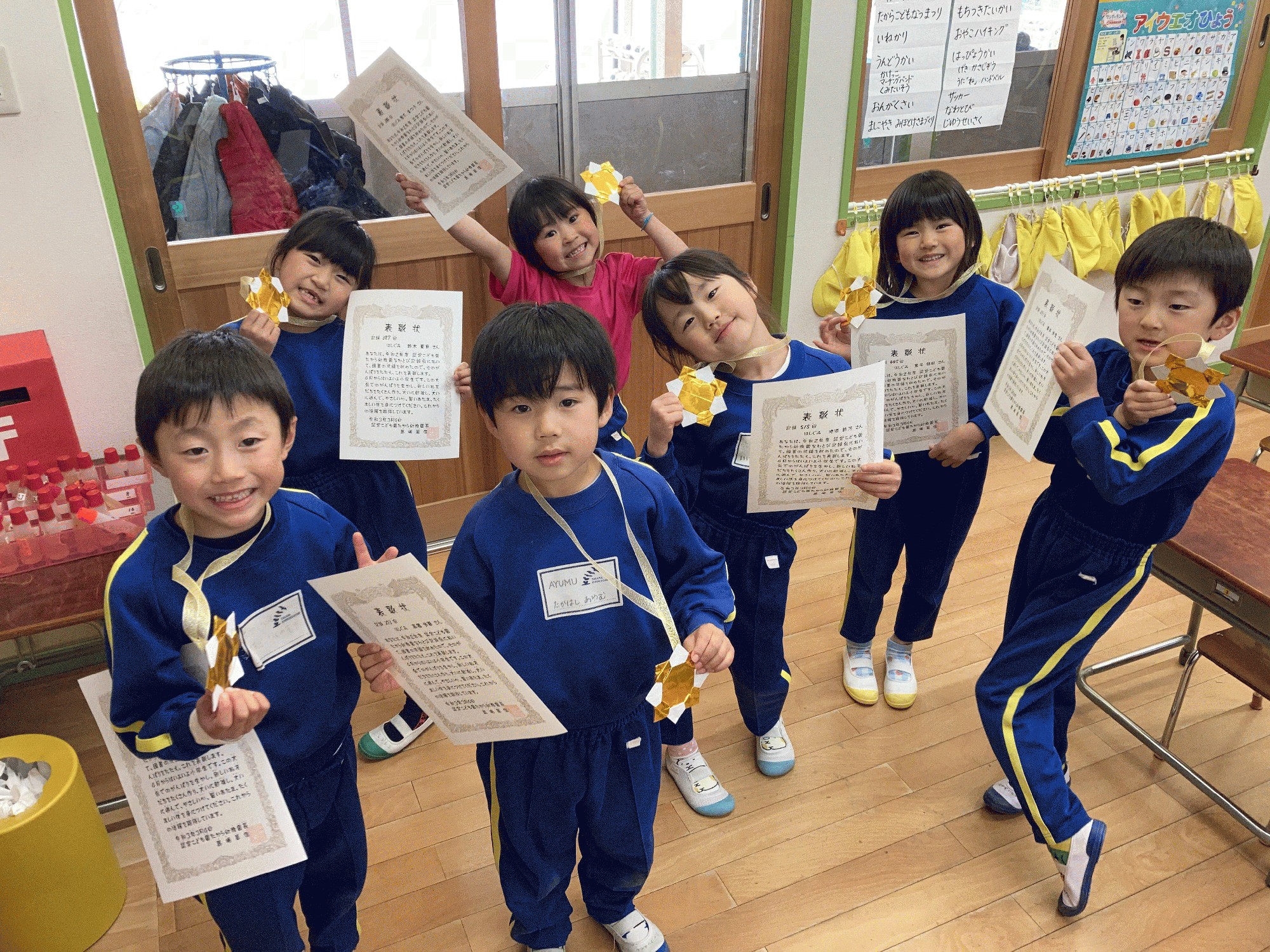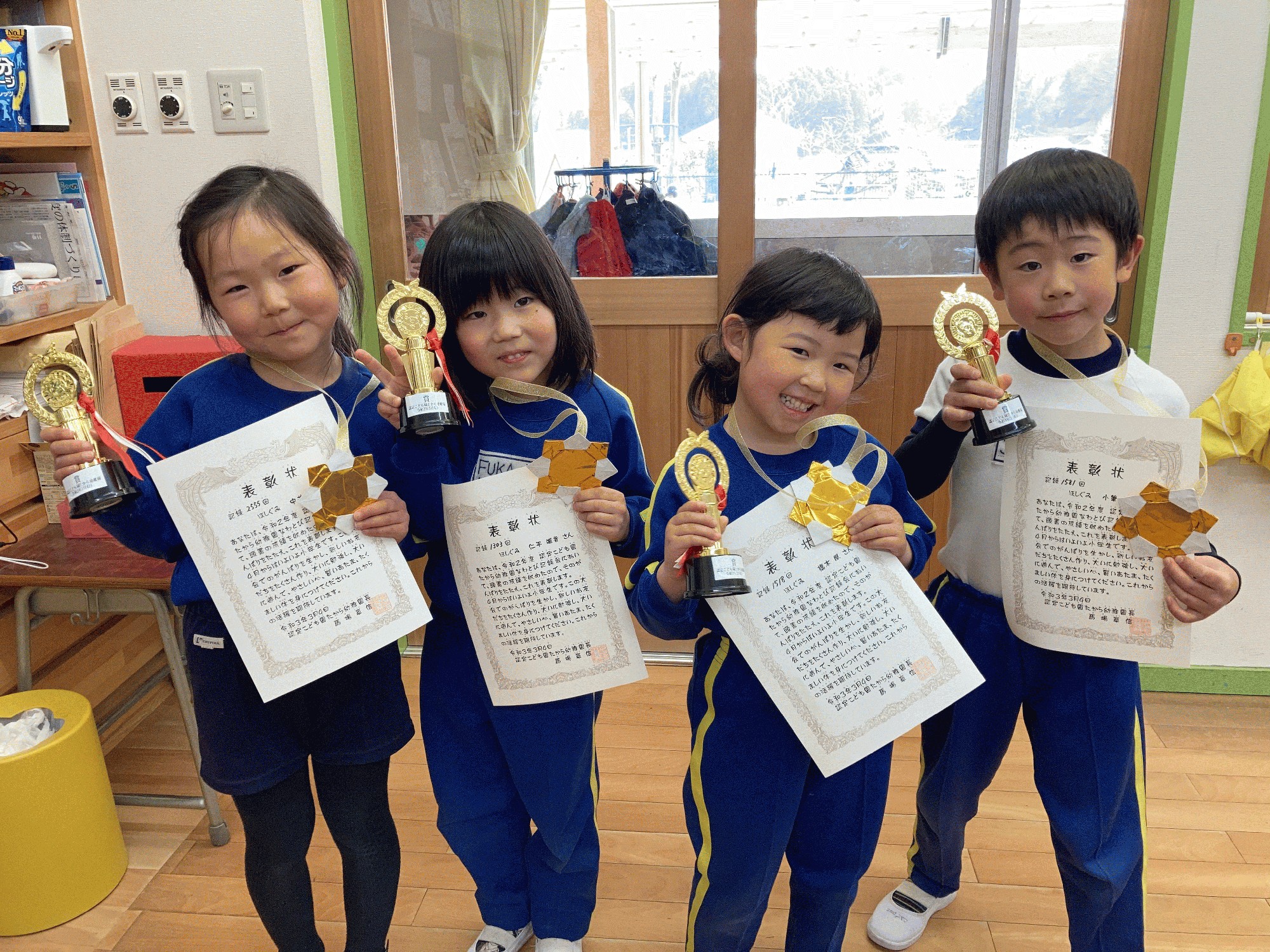 ★今日は「なわとび記録会」でした。みんな頑張って跳ぶことができました。自己記録を更新したお友だちもたくさんいました(*^ω^*) 全員にメダルと賞状が贈られました。 賞状の回数は4月から今日までの自己最高記録です。 1000回以上のお友だちには金メダルとトロフィーが贈られました。