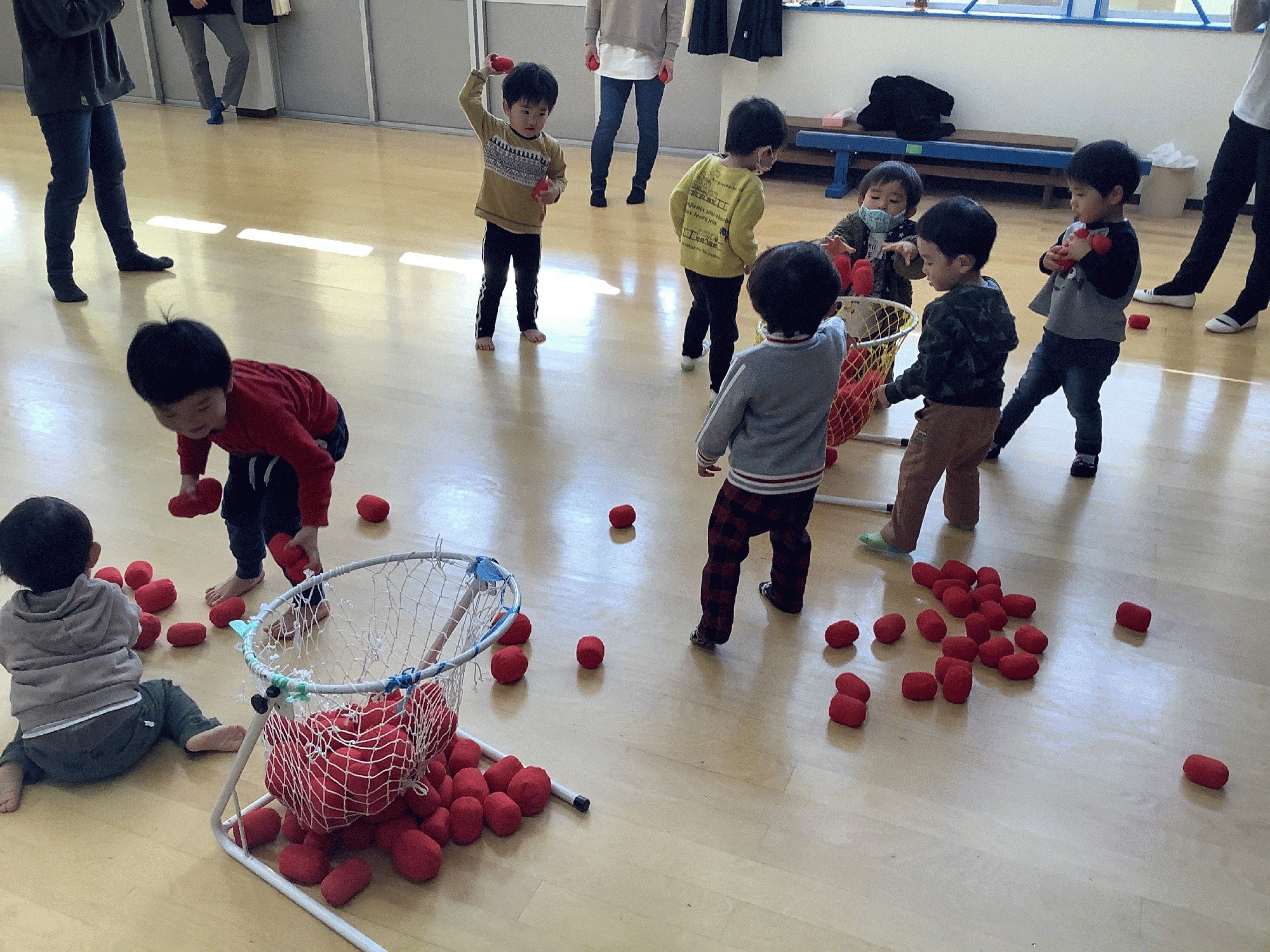 今日が最後なので、今まで遊んだ器具を色々出して トンネルくぐり.鉄棒.平均台渡りにトランポリン、それから玉入れやボール遊びもしました。今では、みんなマットのお山もしっかり自分の力で登ったり降りたり(飛んだり)できるようになりましたね!この一年のみんなの成長が嬉しいです✨✨
