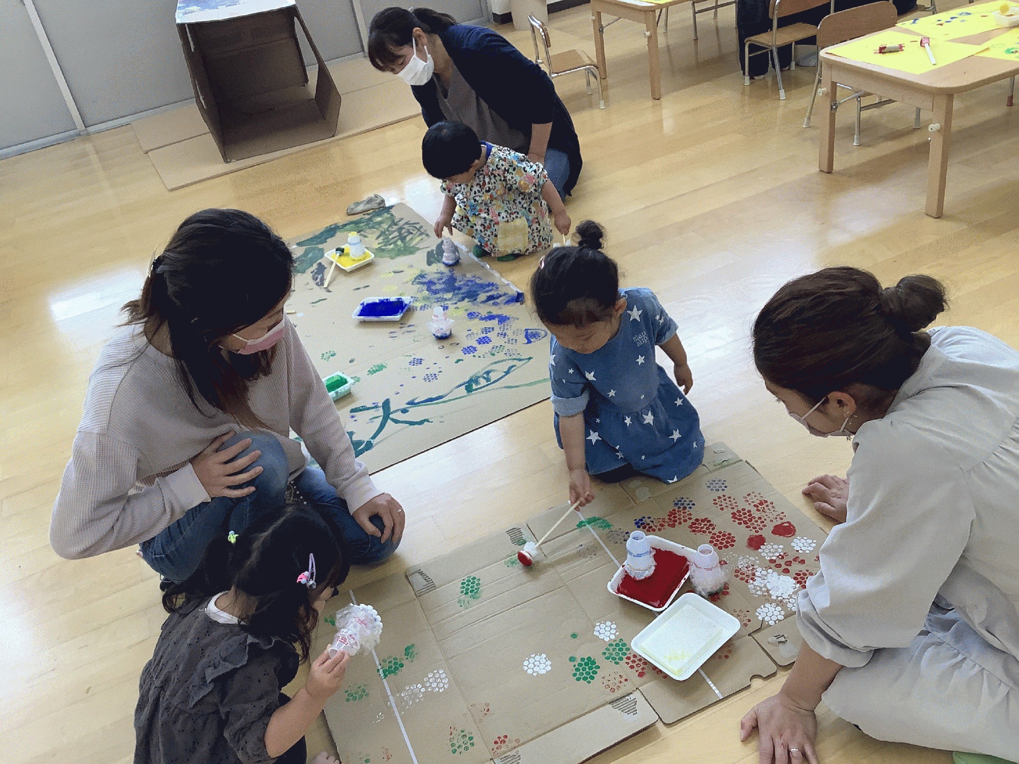 青.赤.黄色.緑.白のスタンプ台を用意して、スポンジやタンポ.プチプチで作ったスタンプをペタペタ押して遊びました。画用紙だけでなく、ダンボールや大きな紙にも自由に押して楽しみました。なかなかアートな作品が出来あがりました‼d(^_^o)