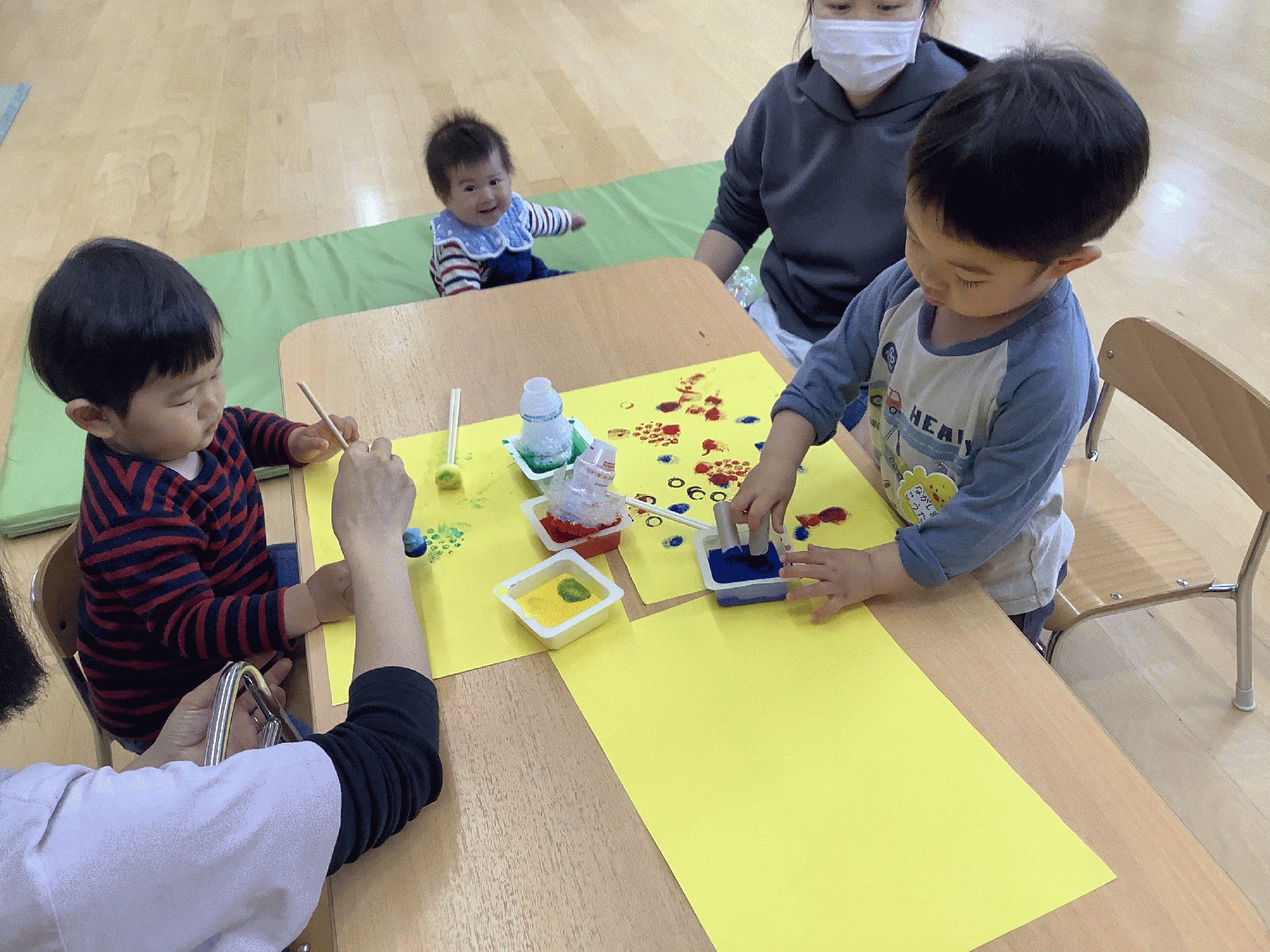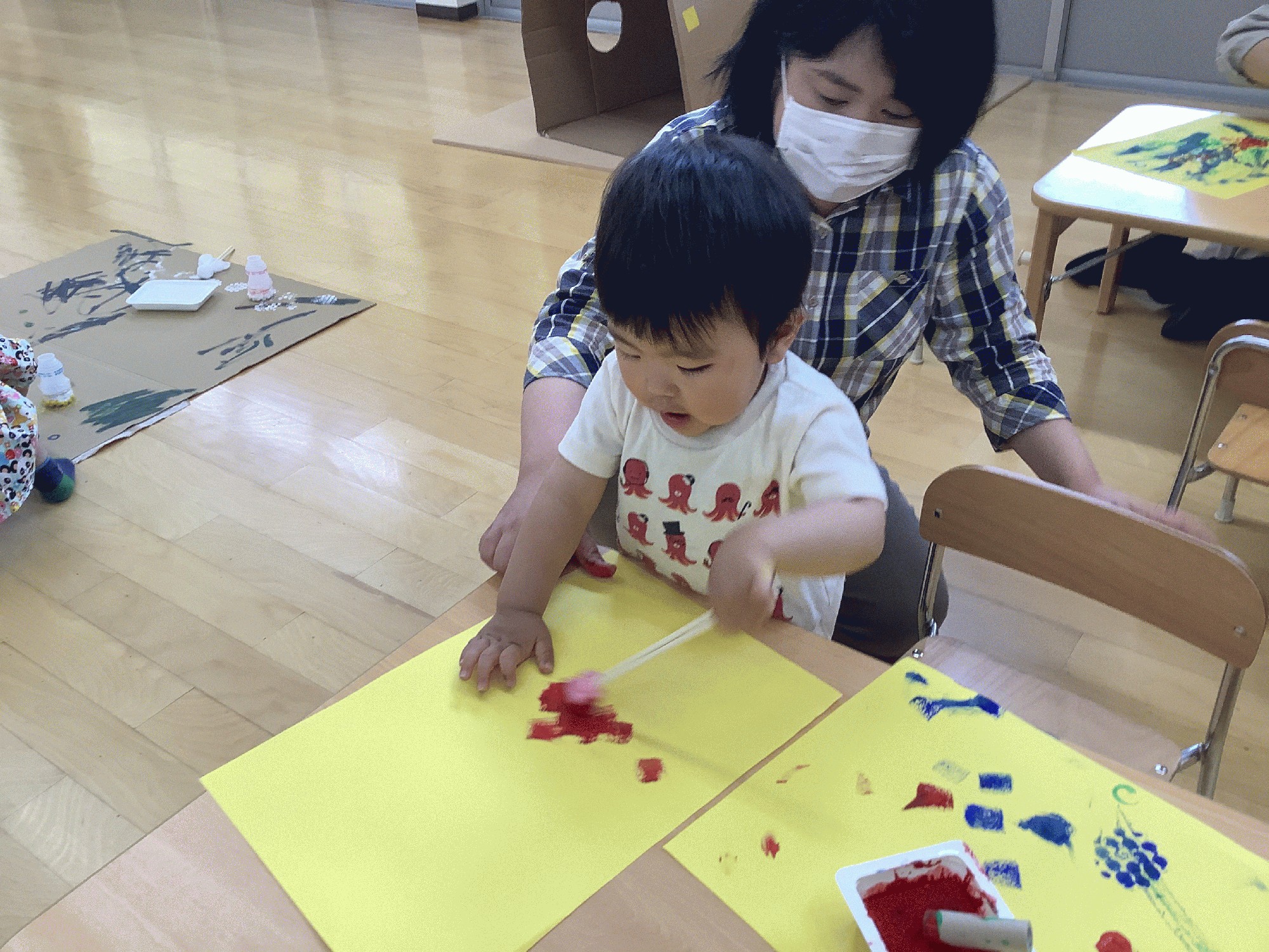 今日は色水遊びの予定でしたが、雨天のため次回の活動と交換してスタンプ遊びをしました。