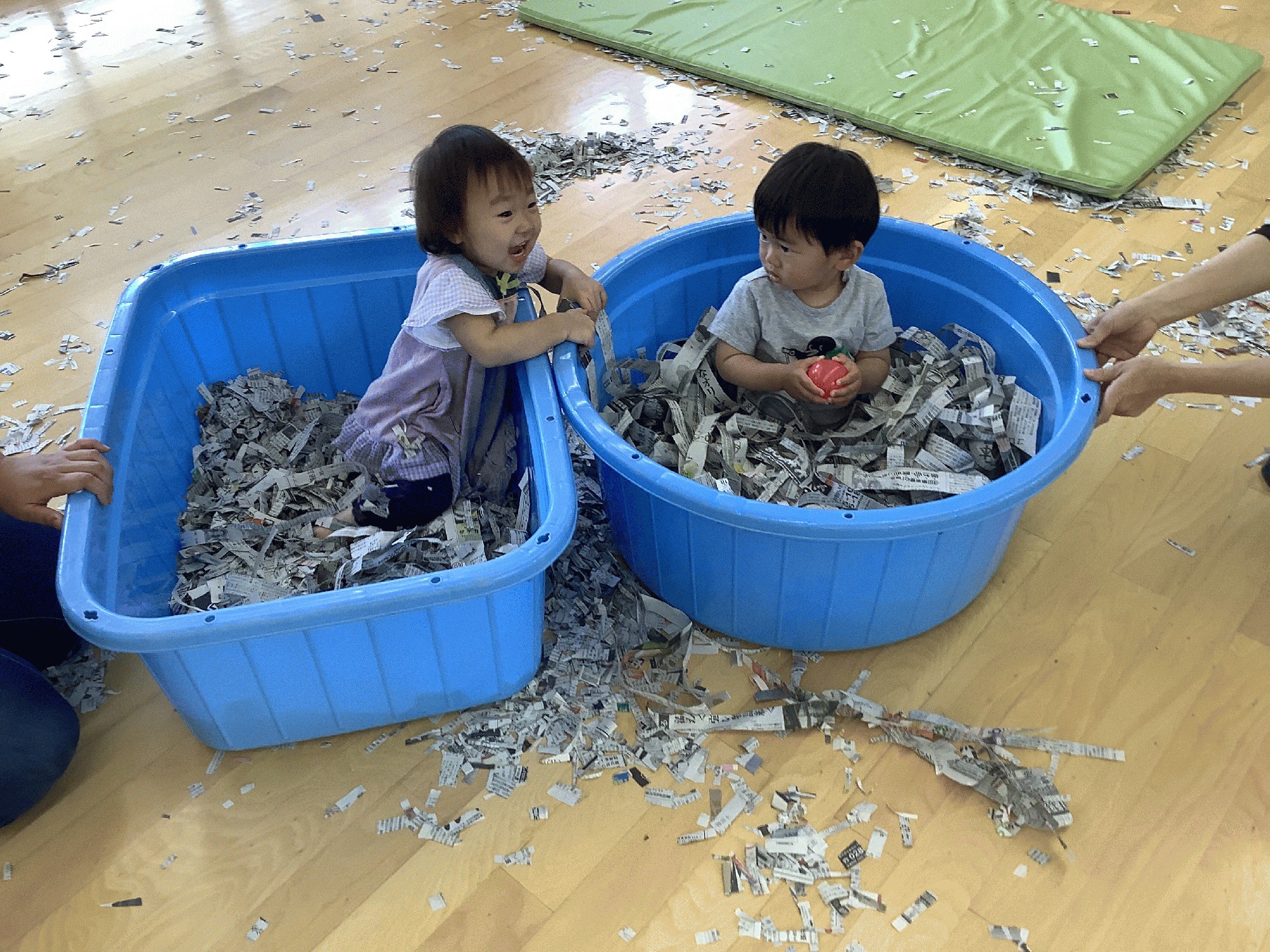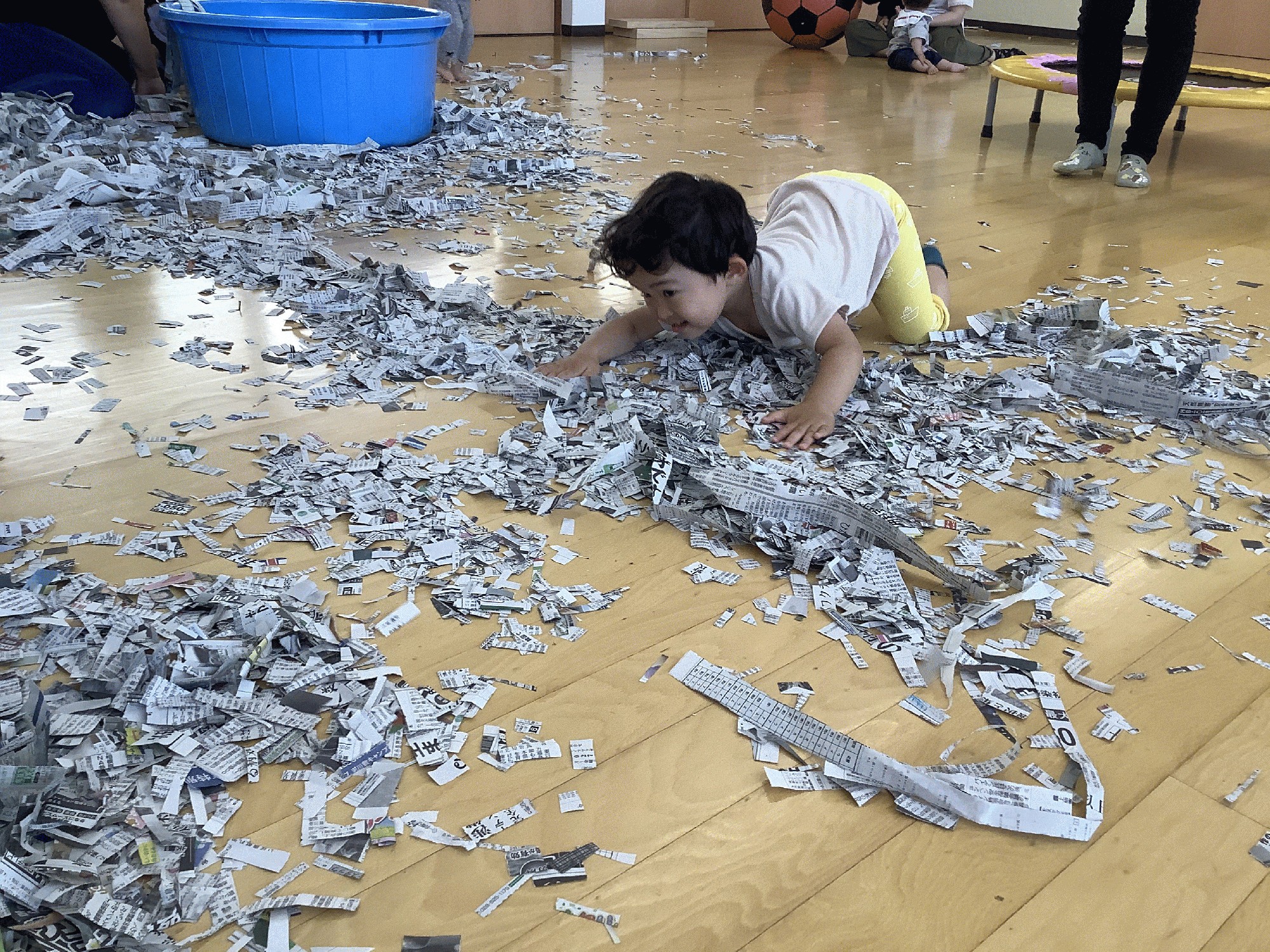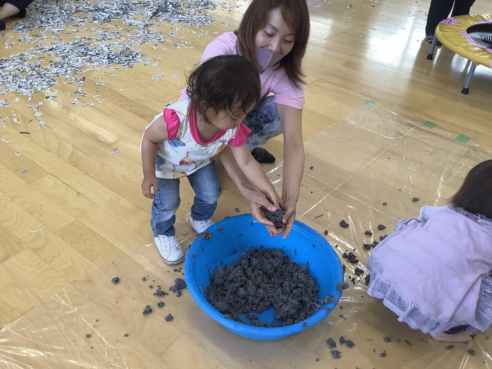 今日は新聞紙遊び。最初に「新聞紙シアター」をみんなで見てから、「新聞紙の花火」を作ったり新聞紙のプールに入ったり雨を降らせたりして遊びました。今日は、ほかに細かく切った新聞紙を水に浸して作った新聞紙粘土のコーナーも用意して、こねたり丸めたりして感触を楽しみました。気持ちよかったですね(*≧∀≦*)