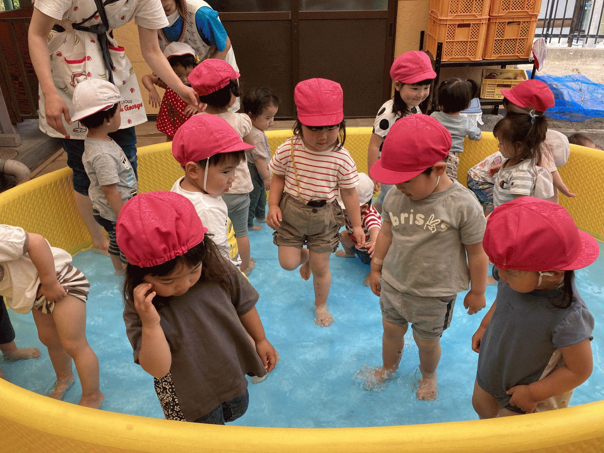 ★今日、プール開きをしました。子どもたちは、いつもと違う衣装の園長先生がお経を唱える様子を静かに見ていることができました。そして、子どもたちも手を合わせ、安全に水遊びができるよう一緒にお祈りしました。