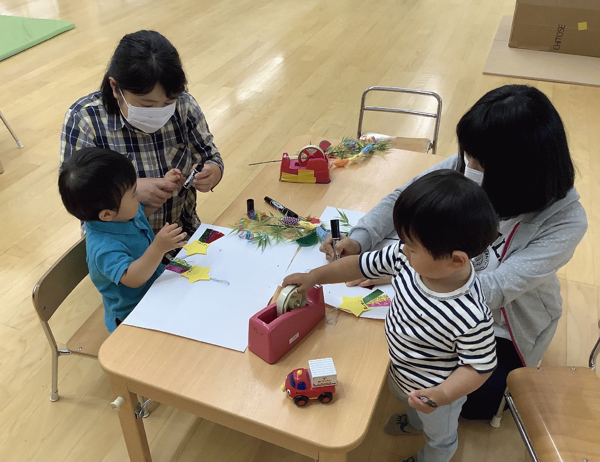 プラスチックのかわいい笹に、親子で輪つなぎやスイカ.提灯.金魚などを飾り付けました。それからお星様の短冊にお願い事を書きました。それぞれに素敵な七夕飾りが完成しましたね! そのあと、前回作った手形プレートにビーズやシーグラス.スパンコールなどを速乾ボンドで貼って綺麗に飾りました。来週の持ち帰りが楽しみですね(*^^*)