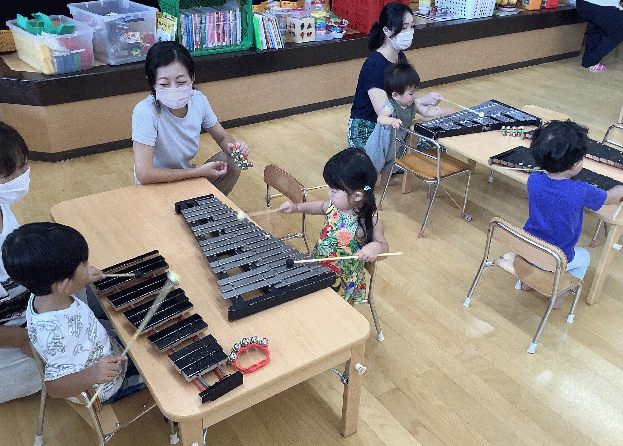 今日は、木琴の他にタンバリンと鉄琴を用意して遊んでみました。木琴と鉄琴の音の違いを感じたり、バチの扱いにも慣れて♪アンパンマンのメロディーに合わせて自由に鳴らして楽しみました(^^)
