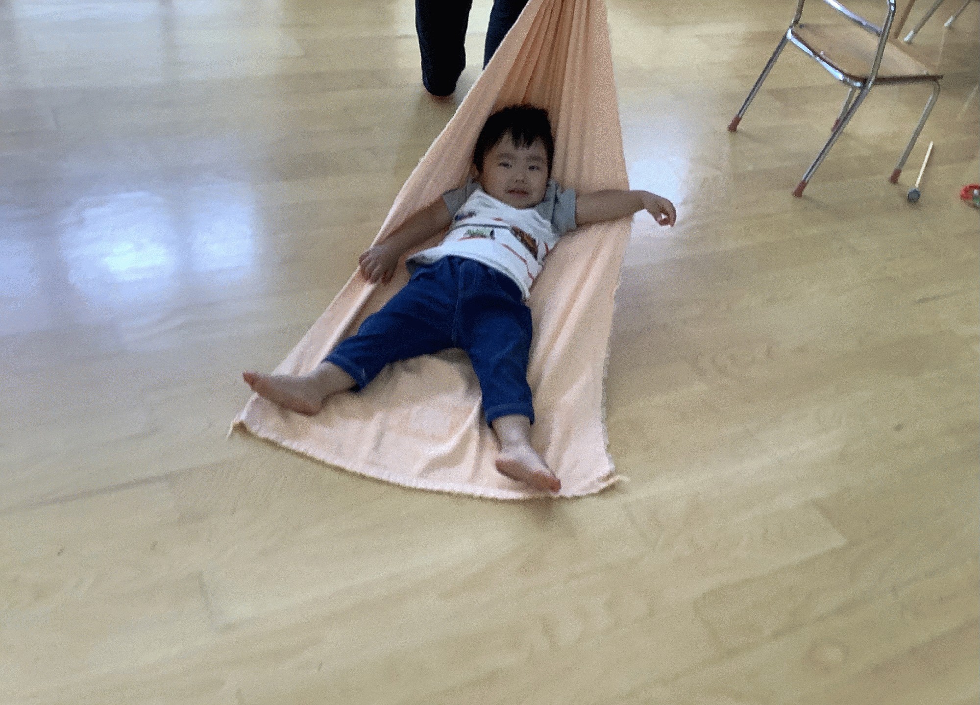 準備運動に、キラキラのポンポンを持って♪バナナくん体操や♪親子でメリーランドをしました。それから、今日は玉入れやトンネル遊び・そしてバスタオルでキャッチボールしたり荷物を運んだり、上に乗って運んでもらったり…色んな遊びをしました。最後は、コースを作ったバランスボードをゴールまで落ちないように渡って、跳び箱からジャンプしてゴール‼︎