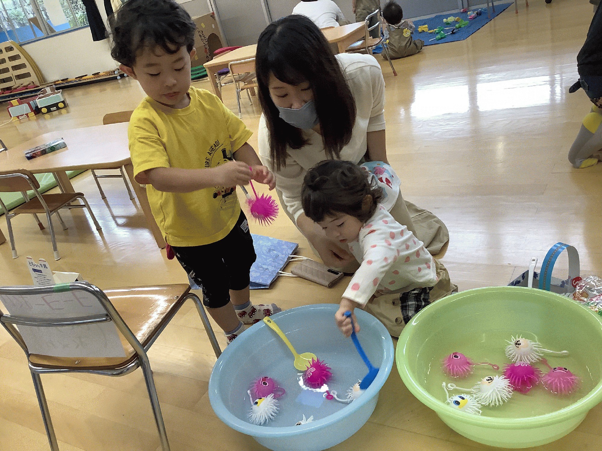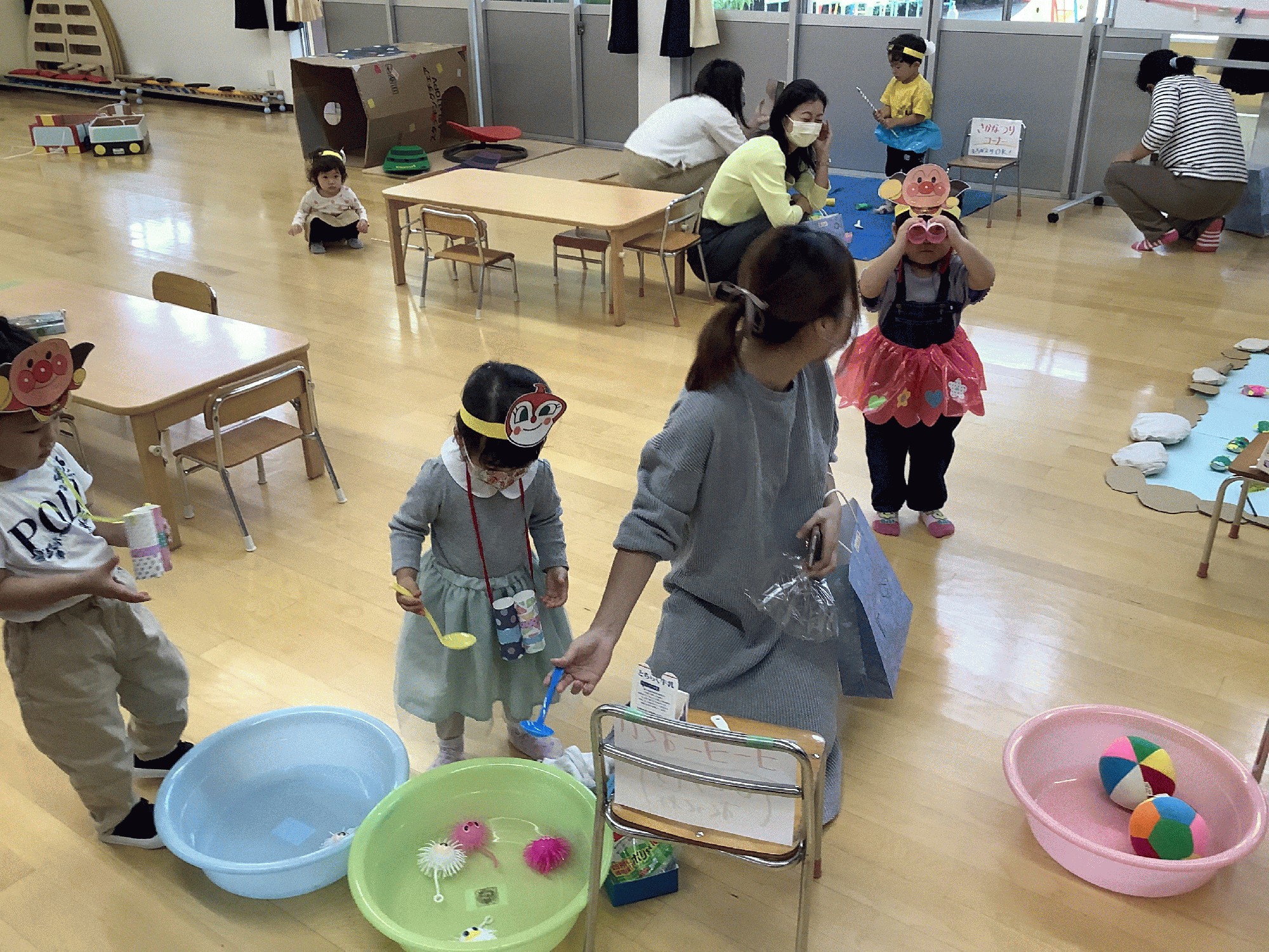 お菓子やお面作りの服やおもちゃ、それから的当てやボーリング、そして釣りコーナーも用意して、みんなで賑やかに遊びました。お買い物券を入れて買い物をする…というのが、まだわからない小さいおともだちも、ママに教えてもらいながら、楽しそうに魚釣りをしたり買った物を身に付けたり…❣️一番にんきは、やはりキラキラ✨のヨーヨーすくいでした(*^_^*)