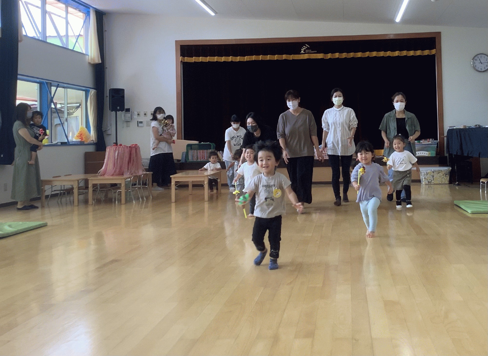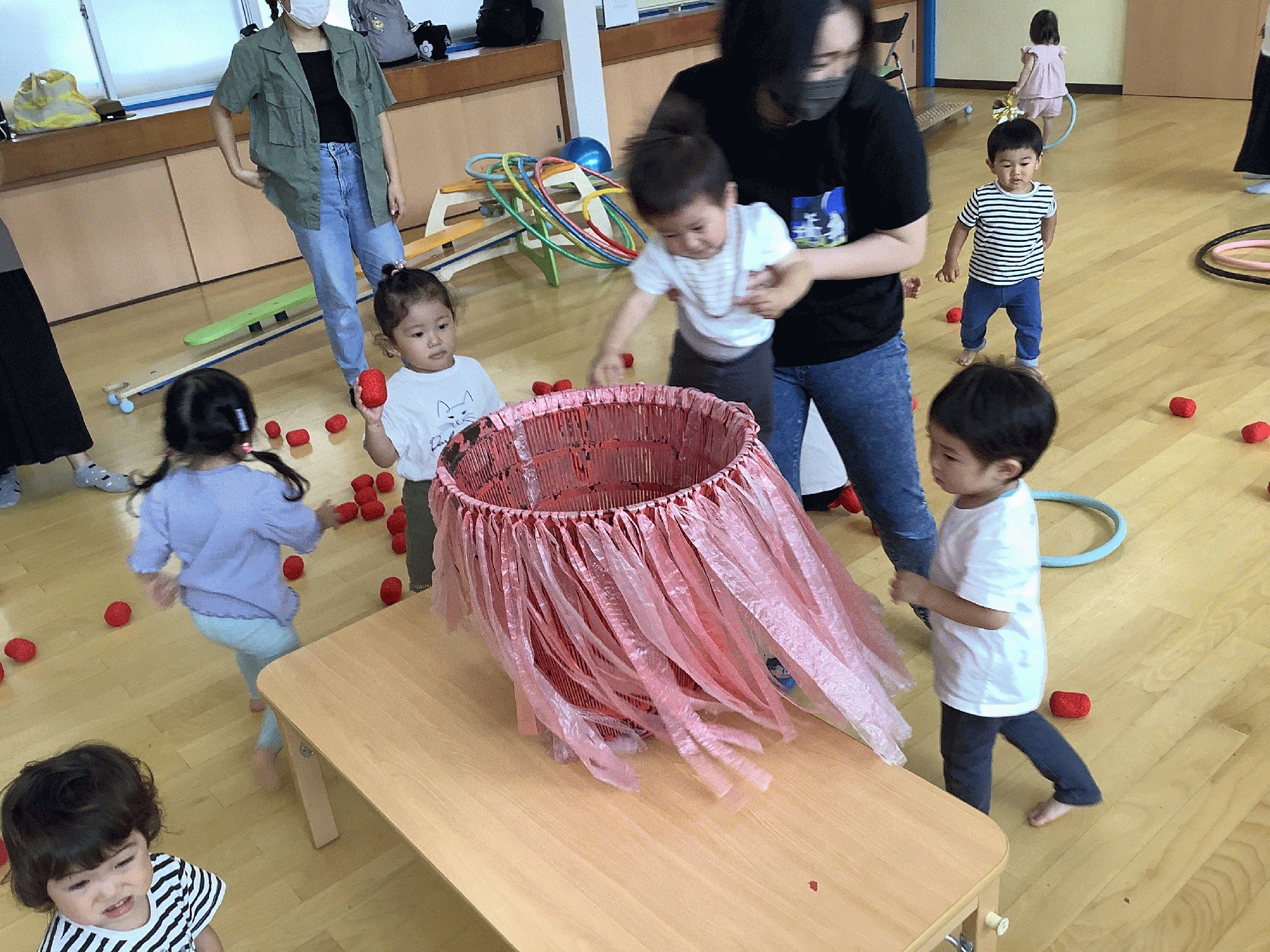今日は前期最後のキッズ。みんなで元気いっぱい運動会ごっこをして、楽しみました。 ポンポンを持って♪バナナくん体操.かけっこ.フープの電車でママと一緒に乗って走ったり.玉入れ競走…。そして最後は障害物競走! 風車を持ってゴールまで走ったら、抱っこで賞品をゲット✨✨ 早速袋から出して、遊んでいました(≧∀≦) がんばったおともだちみんなに、アンパンマンの折り紙メダル🏅をプレゼント。みんなとっても頑張りました。