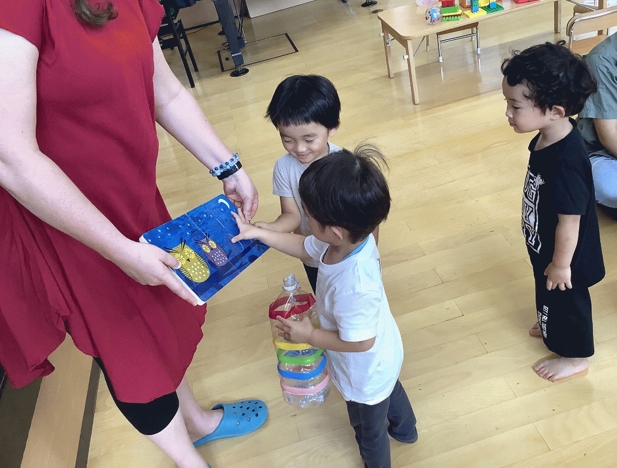 今日の絵本は、大きさや量を表す言葉でした。どのページにも仕掛けがあって、ツマミを引くと絵が変わるのが面白くて、みんな興味を持って見ていました。