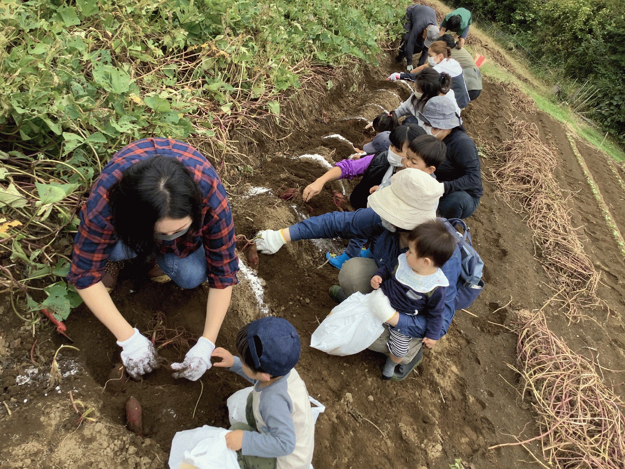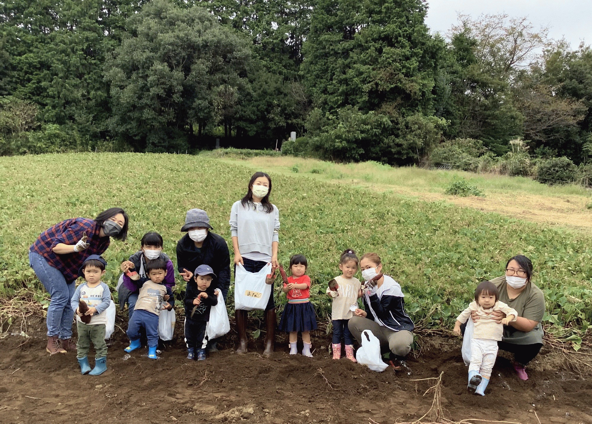 西明寺のおいも畑に、さつまいもを掘りに出かけました。おいも畑の大山さんのおじいちゃんが、おいもの掘り方をアドバイスしてくれて、親子で手や小さいスコップを使って掘りました。掘ったおいもは、それぞれに持ち帰り。どんなお料理に変身するのかな🍠✨