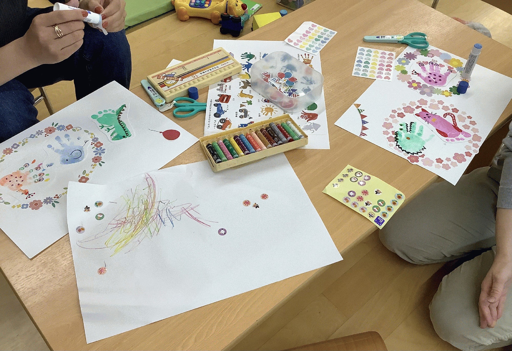 4色のスタンプ台を使って、かわいい手や足をペッタンペッタン♪♪ きれいに押せたら、クレヨンで目鼻や模様を描いて かわいい動物たちにヘンシーン✨ ママたちのセンスと工夫が光る素敵な作品が完成しました!