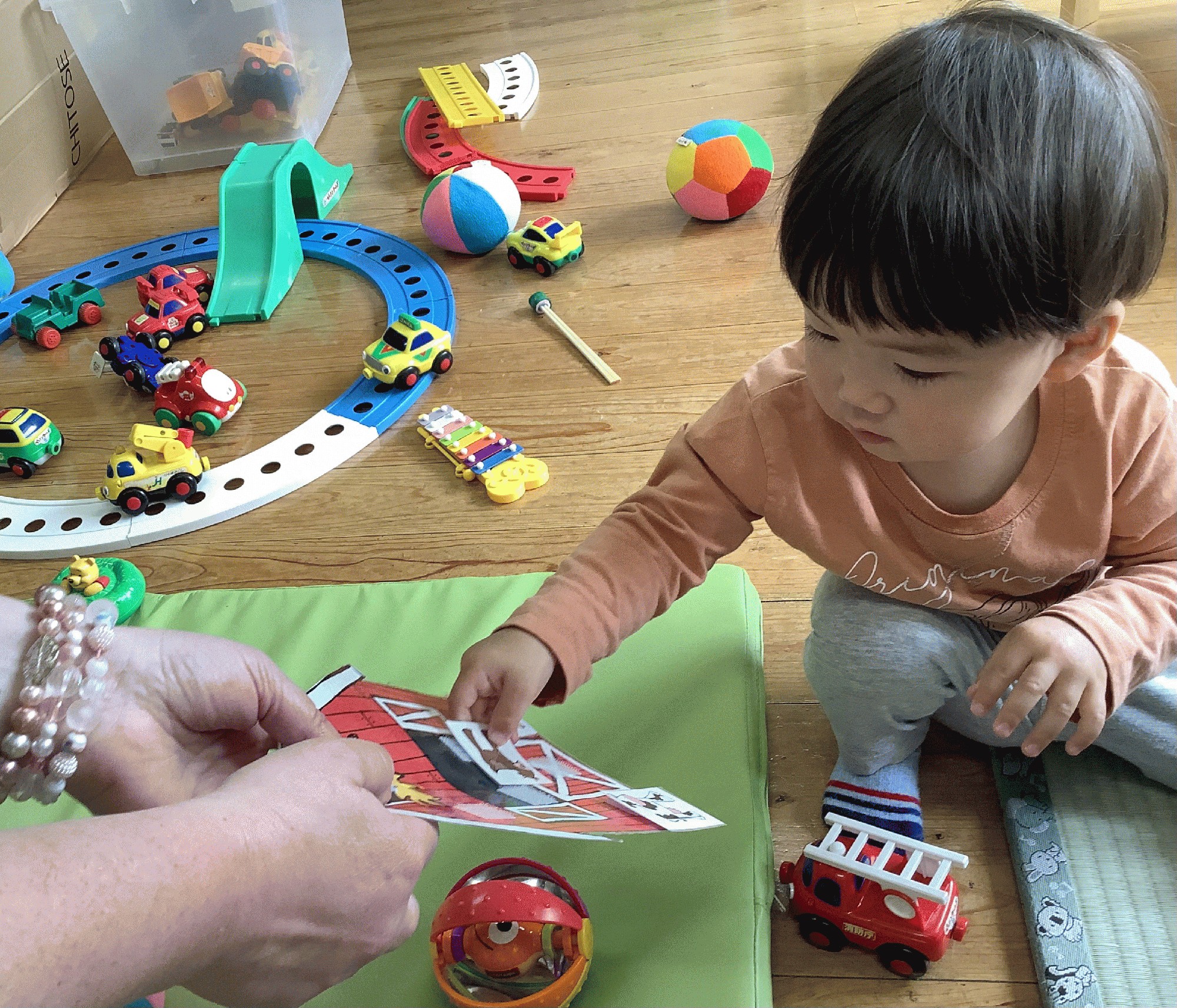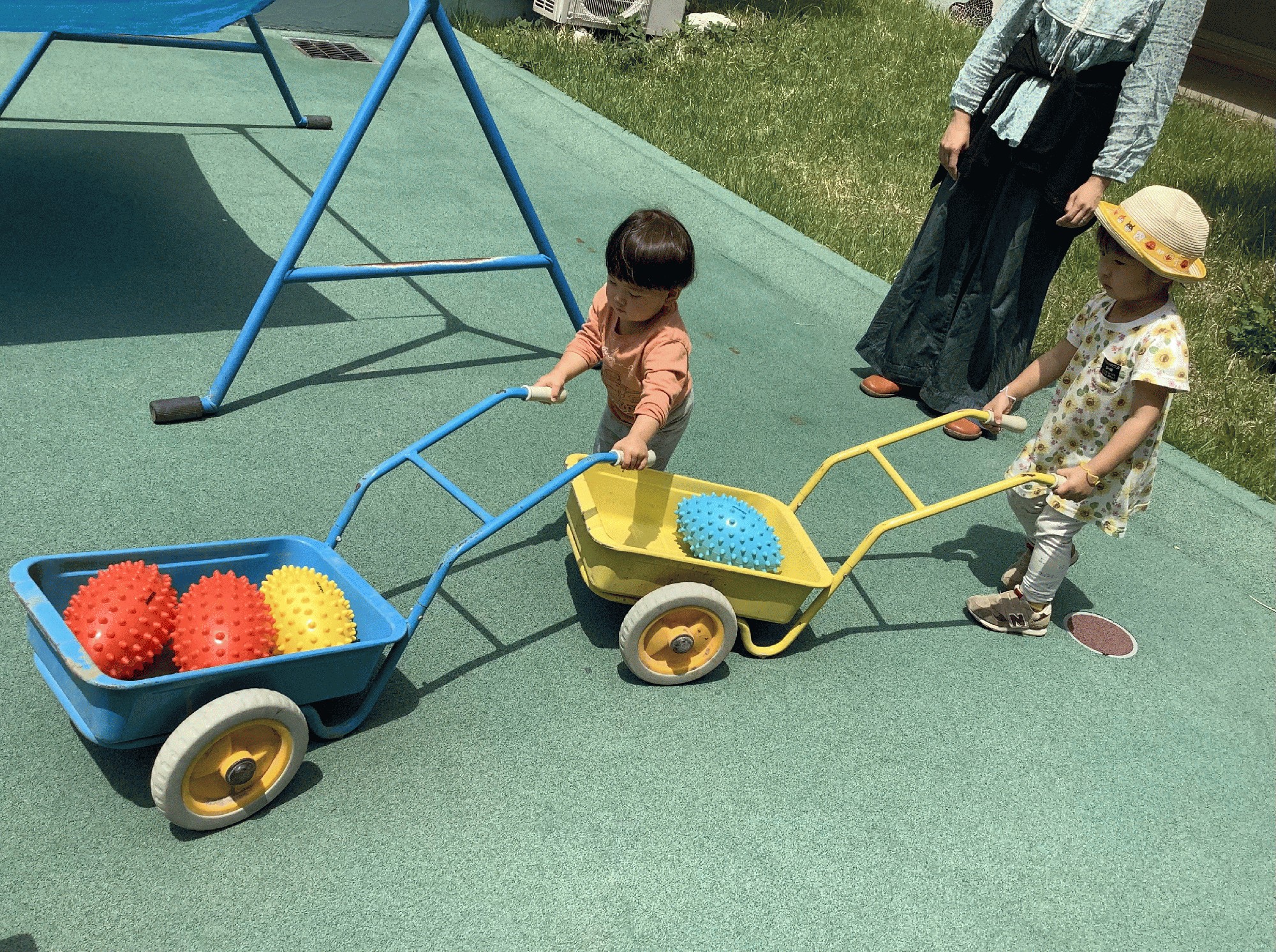 歌遊びを楽しんだあとは、みんなでおもちゃを片付けて お外で遊びました。ボールやフープ.シャボン玉…。中でも、手押し車にボールや風船のお荷物を積んで運ぶのが楽しかった様で、動かし方もだんだん上手になってきました!