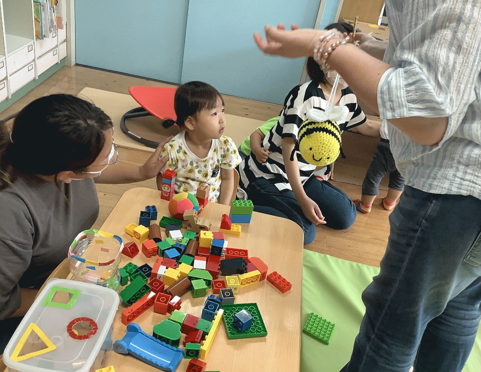 今までハンドパペットだったハチさんが、毛糸を編んで作ったハチさんになっていて、操り人形のようになっていたので みんなちょっとびっくりしていました(^^) それから 色んな動物たちの「peek-a-boo」(いないいなばあ)の絵本を見ました。日本語と違う動物たちの鳴き声が面白かったですね♪