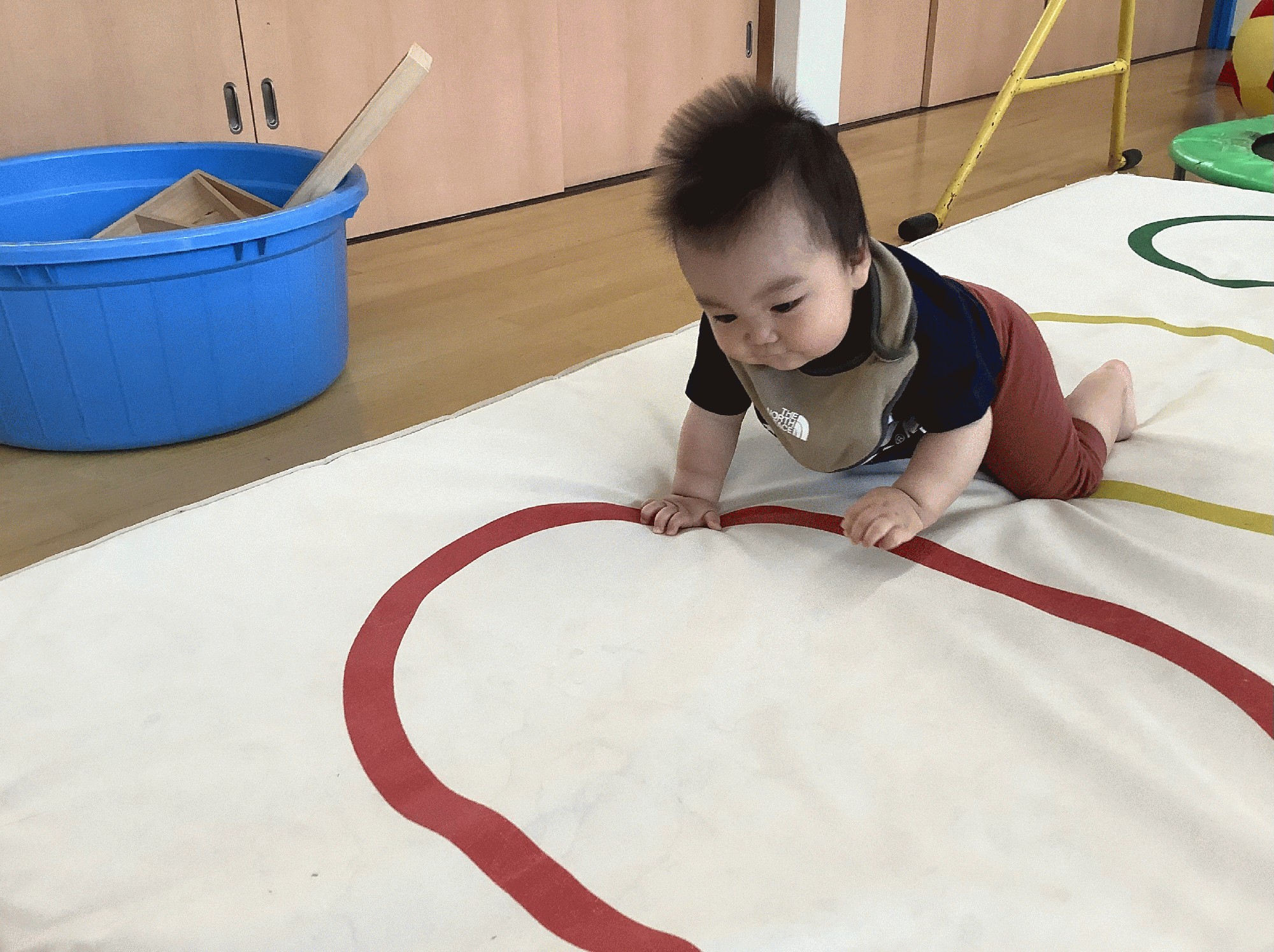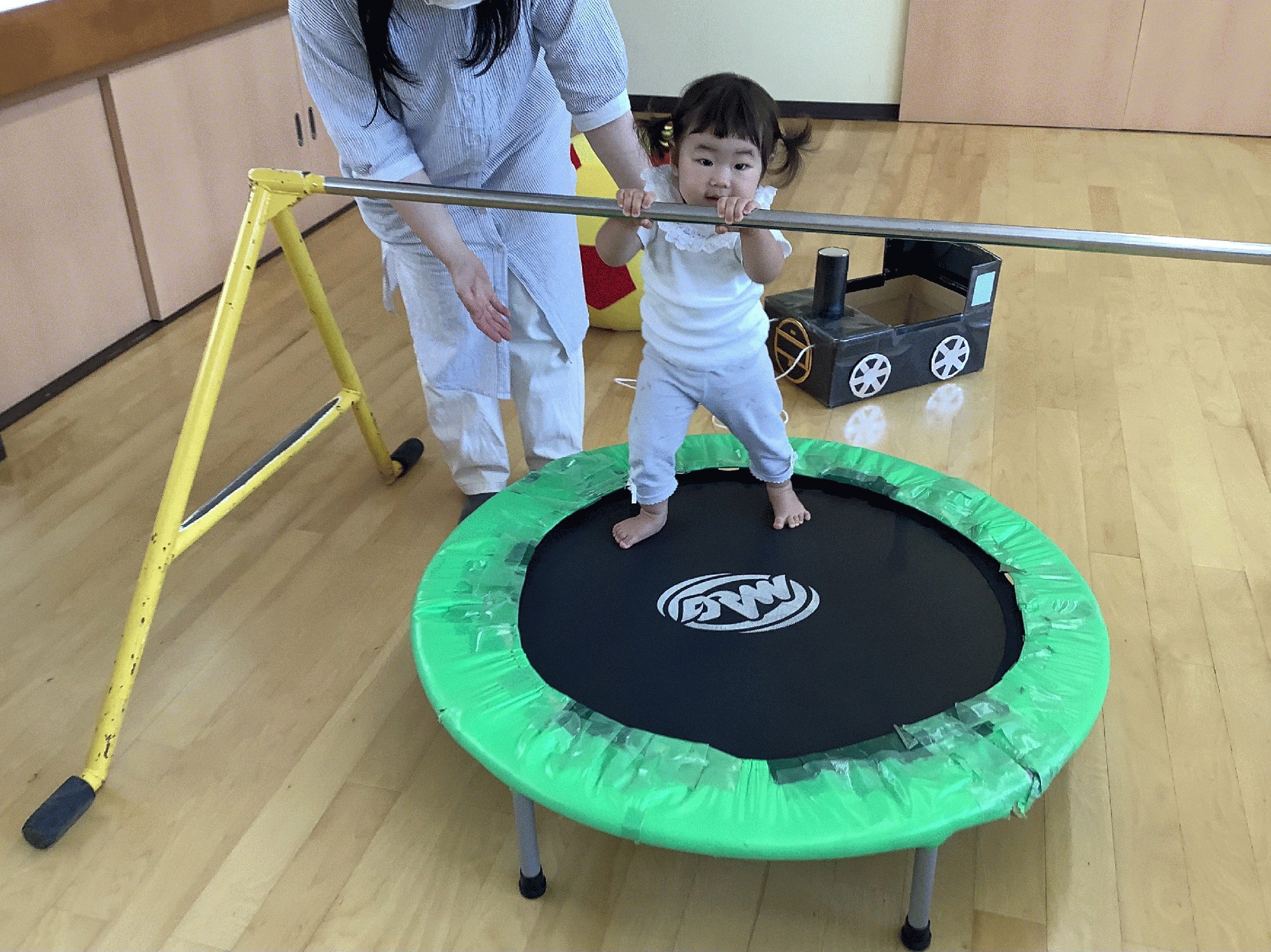 ペープサートや歌遊びを楽しんだあとは、おゆうぎ室の好きなコーナーでいっぱい体を動かして遊びました。ふわふわマットの上を歩いたり、バランスボードや鉄棒.平均台.坂道登り…。それから、くるくるビークルに乗ったり、箱で作った車に乗って ママに引っ張ってもらったり! 全身を使って、楽しく遊びました♬
