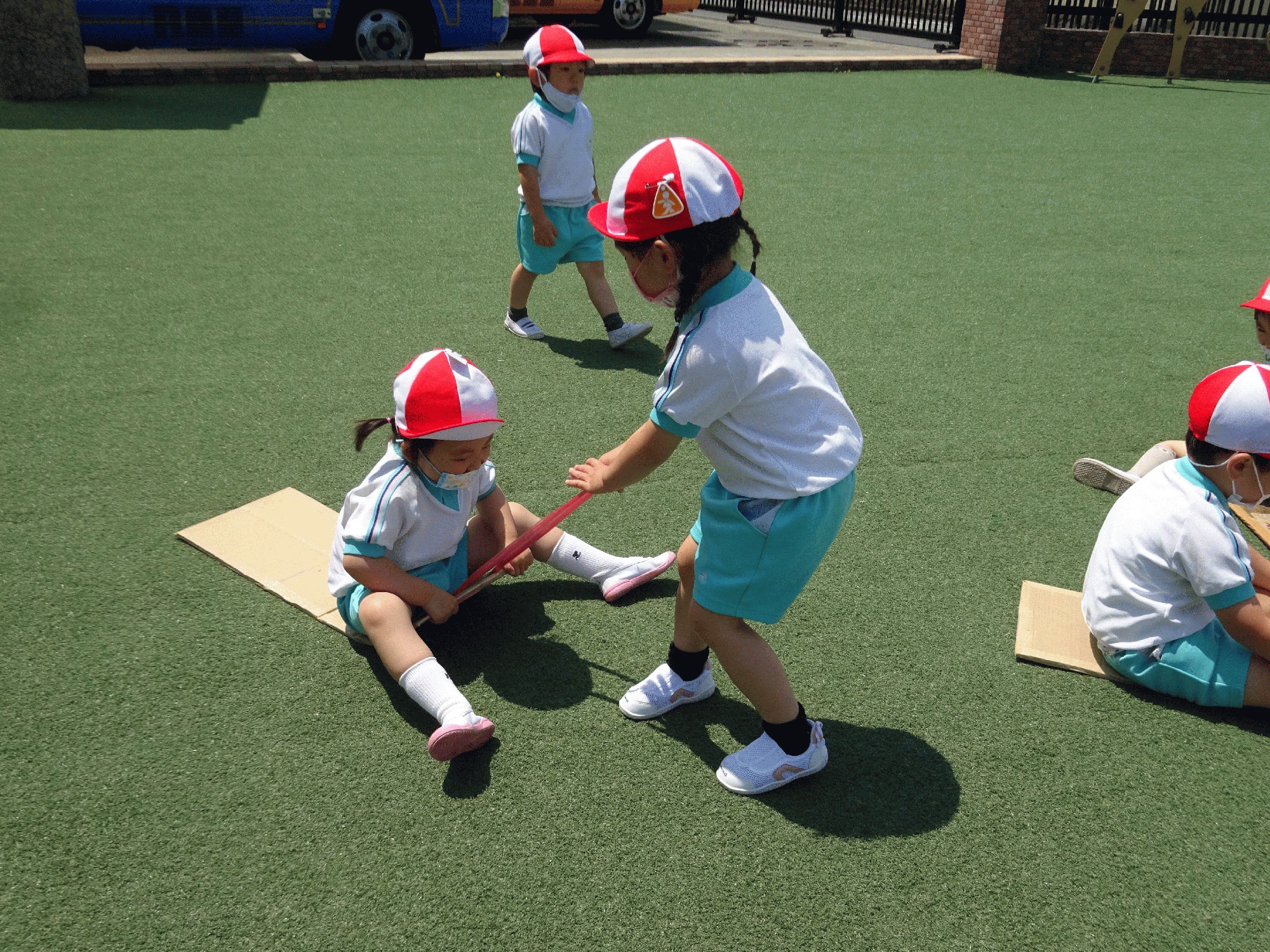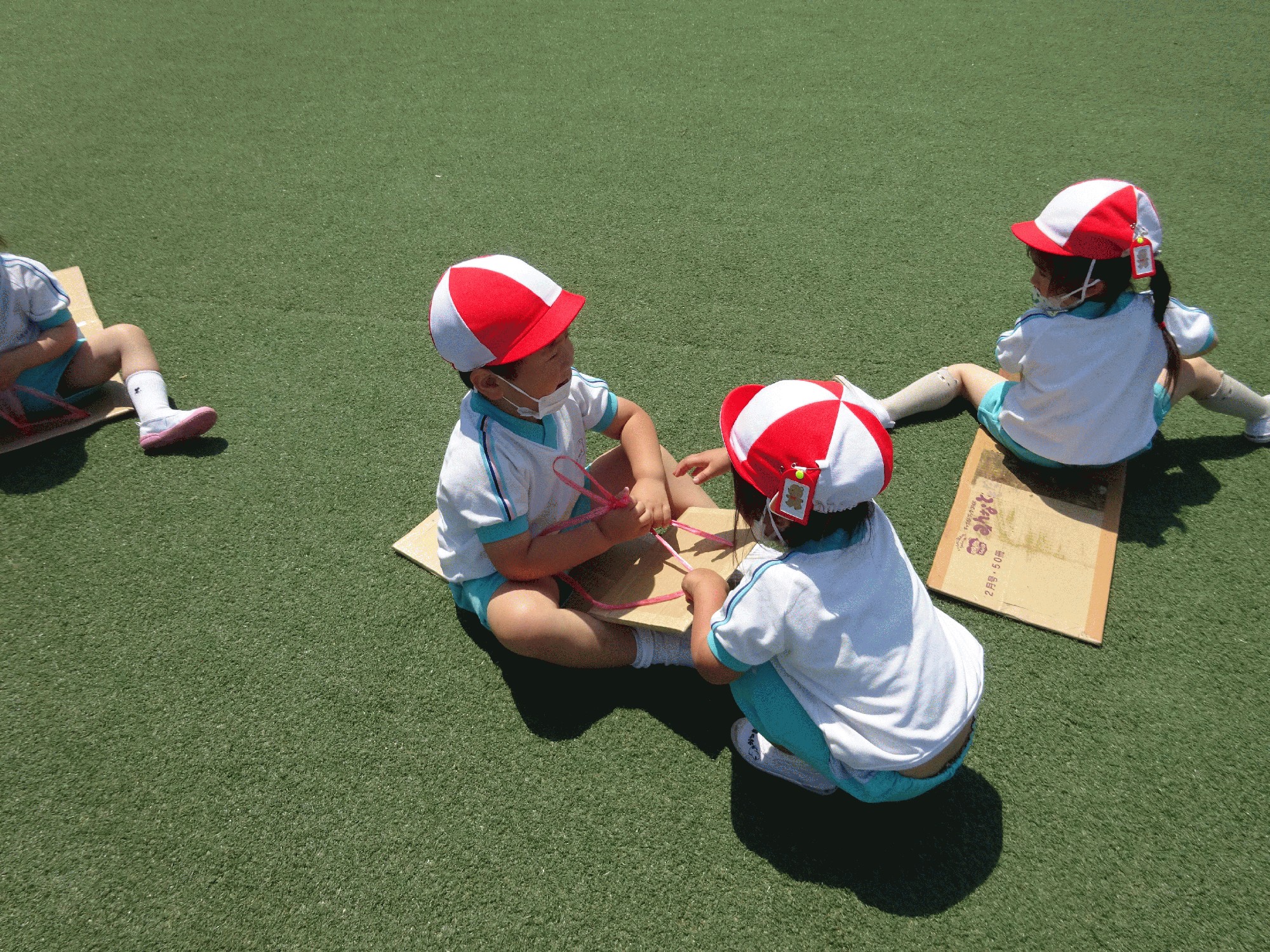 園歌を歌い終わったら芝生に行き親子遠足でも使ったダンボールで遊びました💗