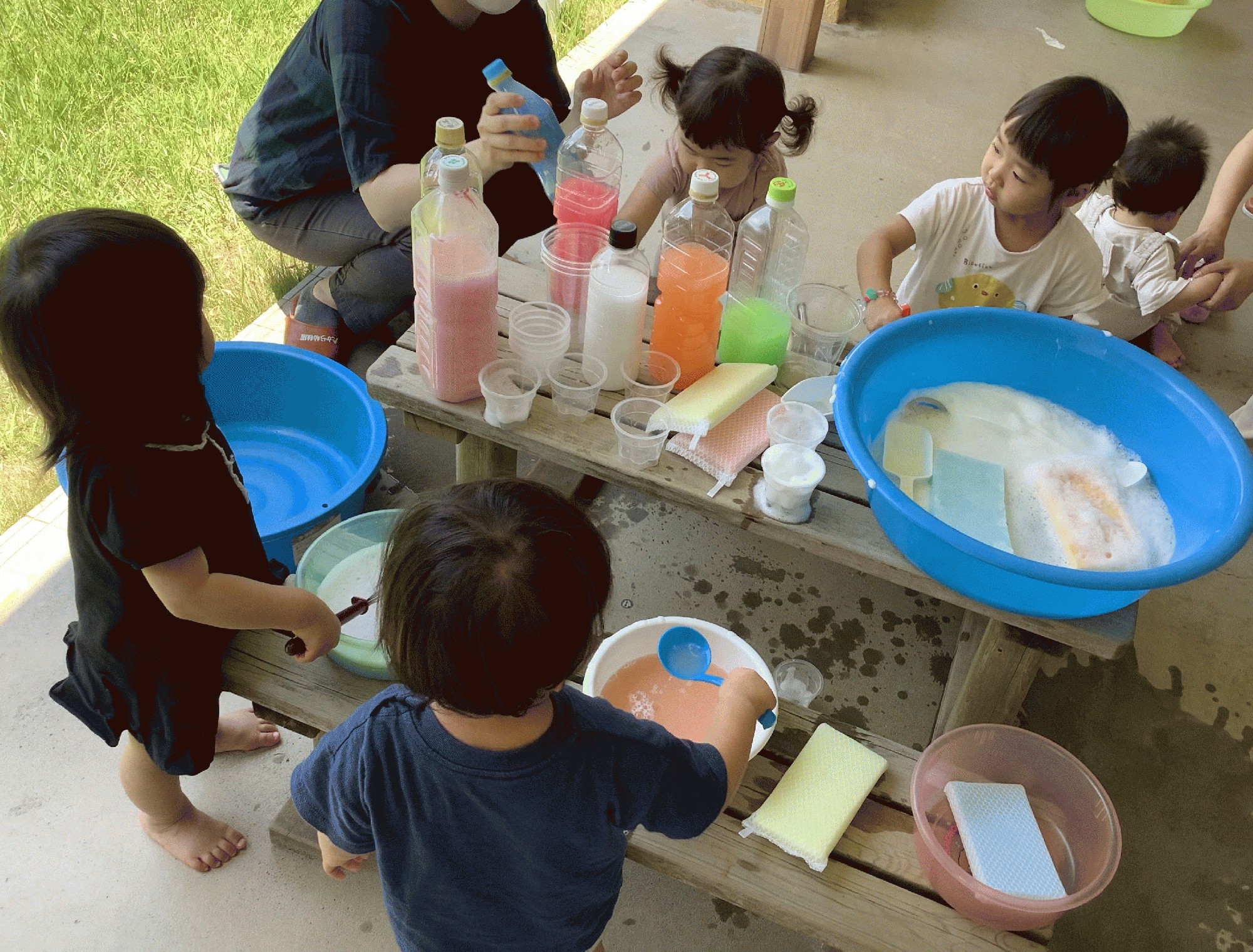 大きなお友だちは、ペットボトルに作った色水を カップやプリンの空き容器に注いだり、ハンドソープで作った泡をお玉やスプーンで掬ったりして遊びました。ふわふわな泡の感触や色水の変化など、みんな興味津々で楽しんでいました(^∇^)