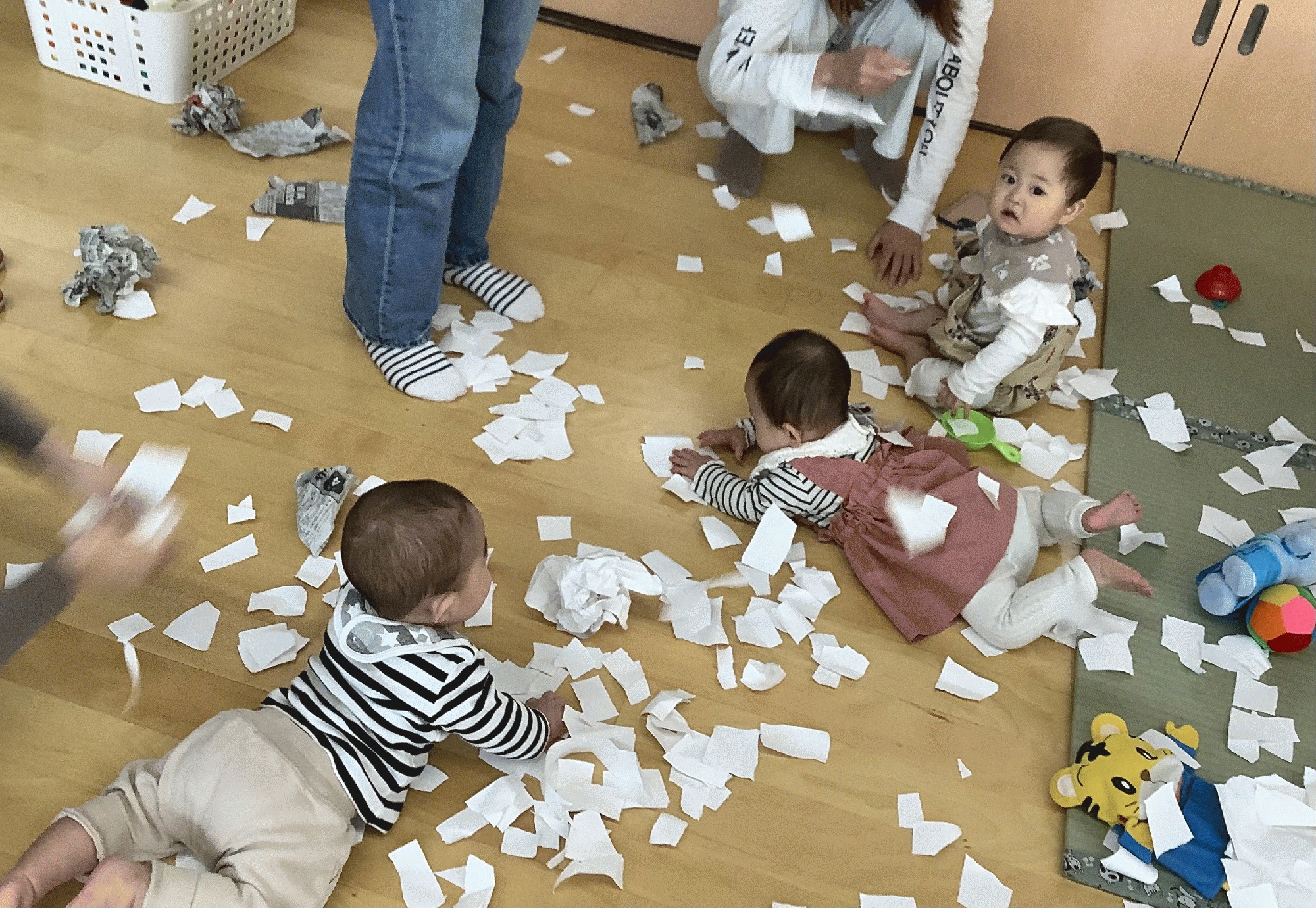 大きいまま、顔を隠して「いないいないばあ」をしたり、穴を開けて覗いたり…それから、新聞紙を細かく千切ったり長く割いて、小さいプールに入れたり 上から雪のように降らせたりして、全身新聞紙まみれになって遊びました。まだ、新聞紙をお口に入れてしまうお友だちは、白い紙や風船を使って遊んでみましたよ♫楽しかったですね!