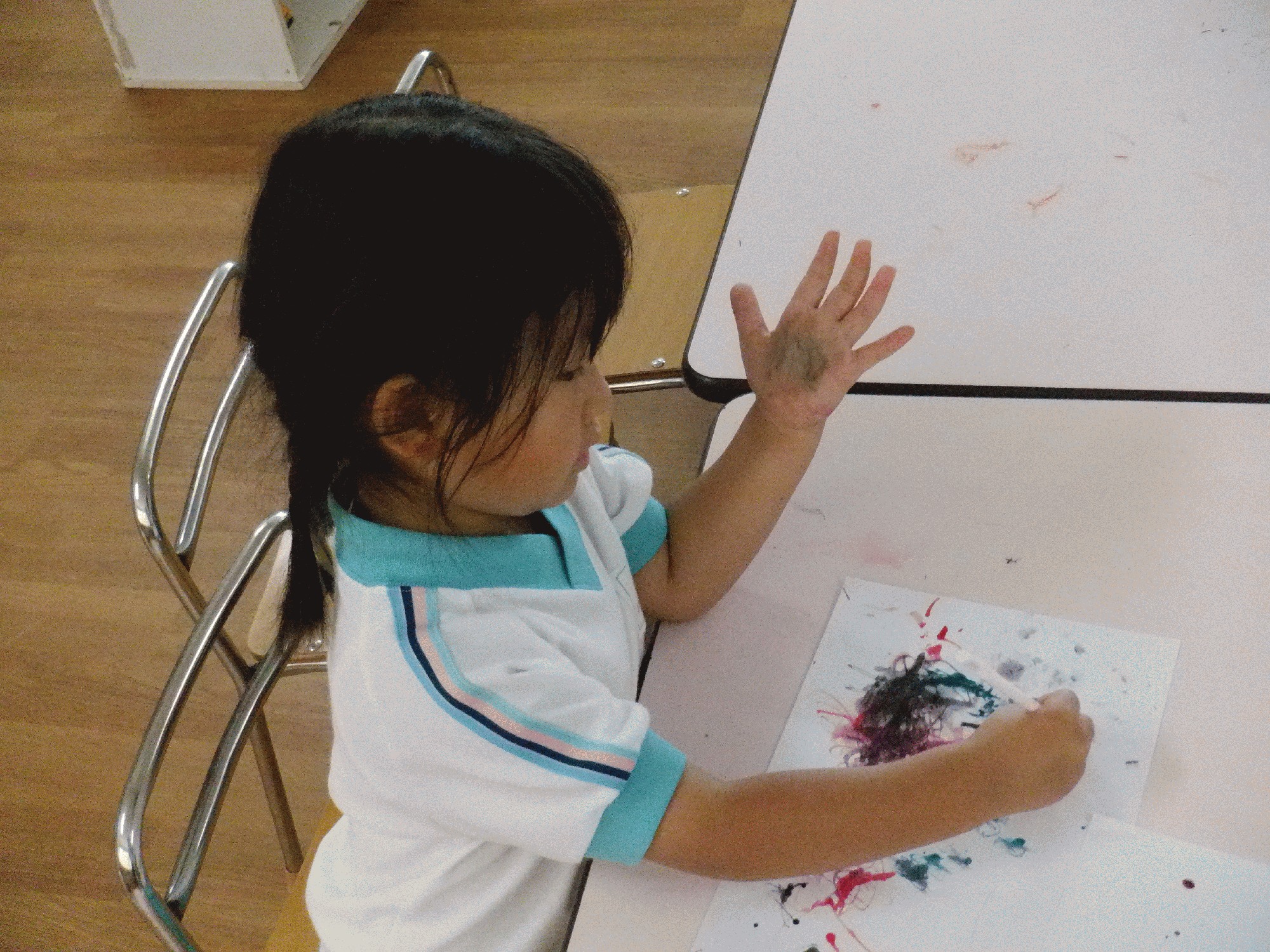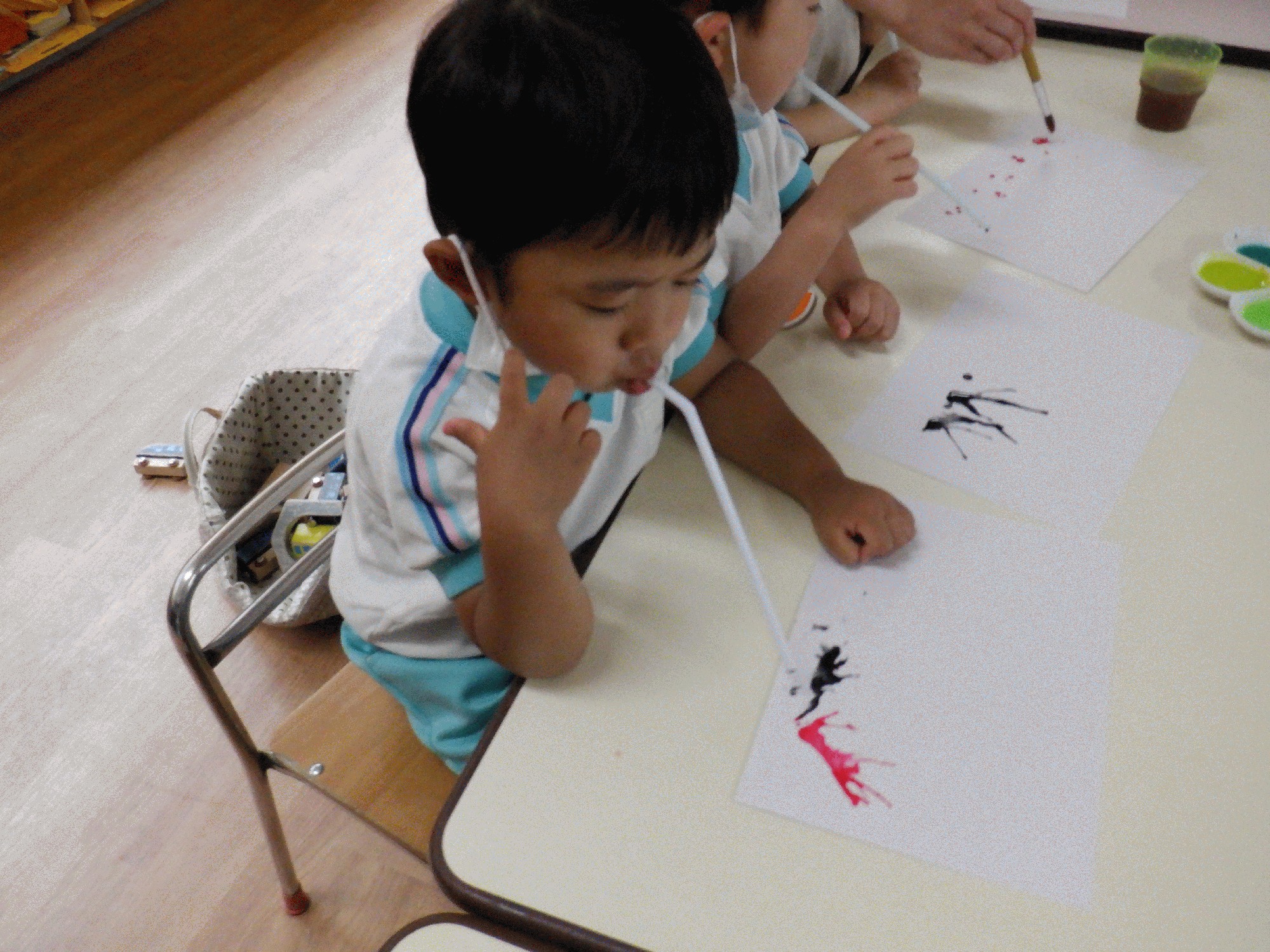 息を吹く動作と絵の具の広がりを楽しんでいました。