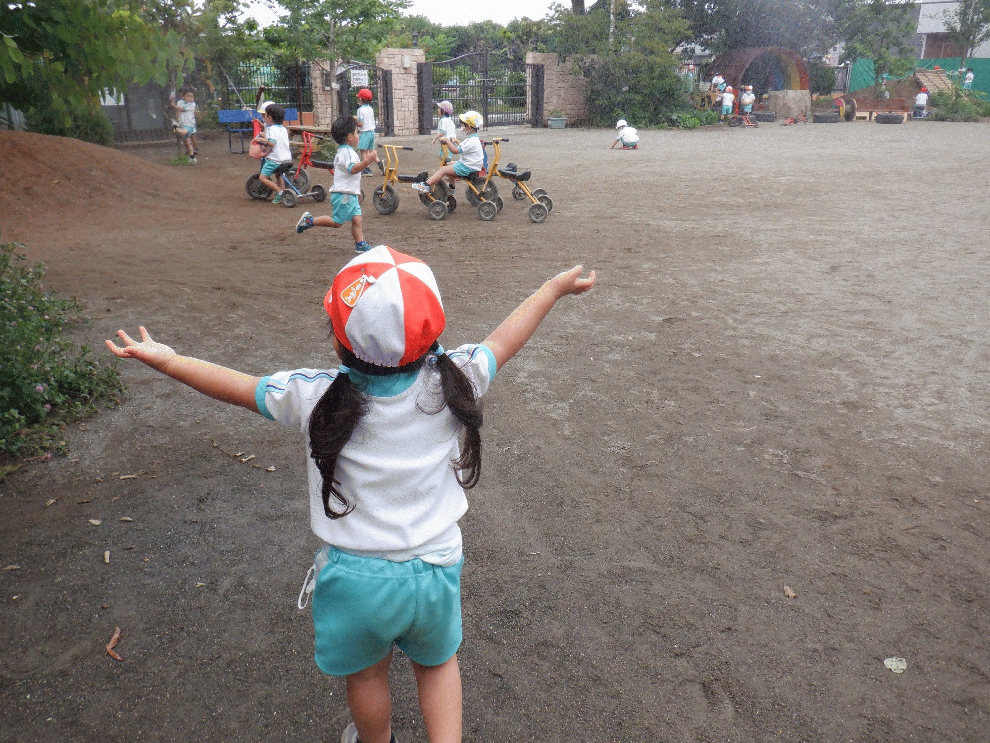 園庭にあるミストを浴びる姿がありました。