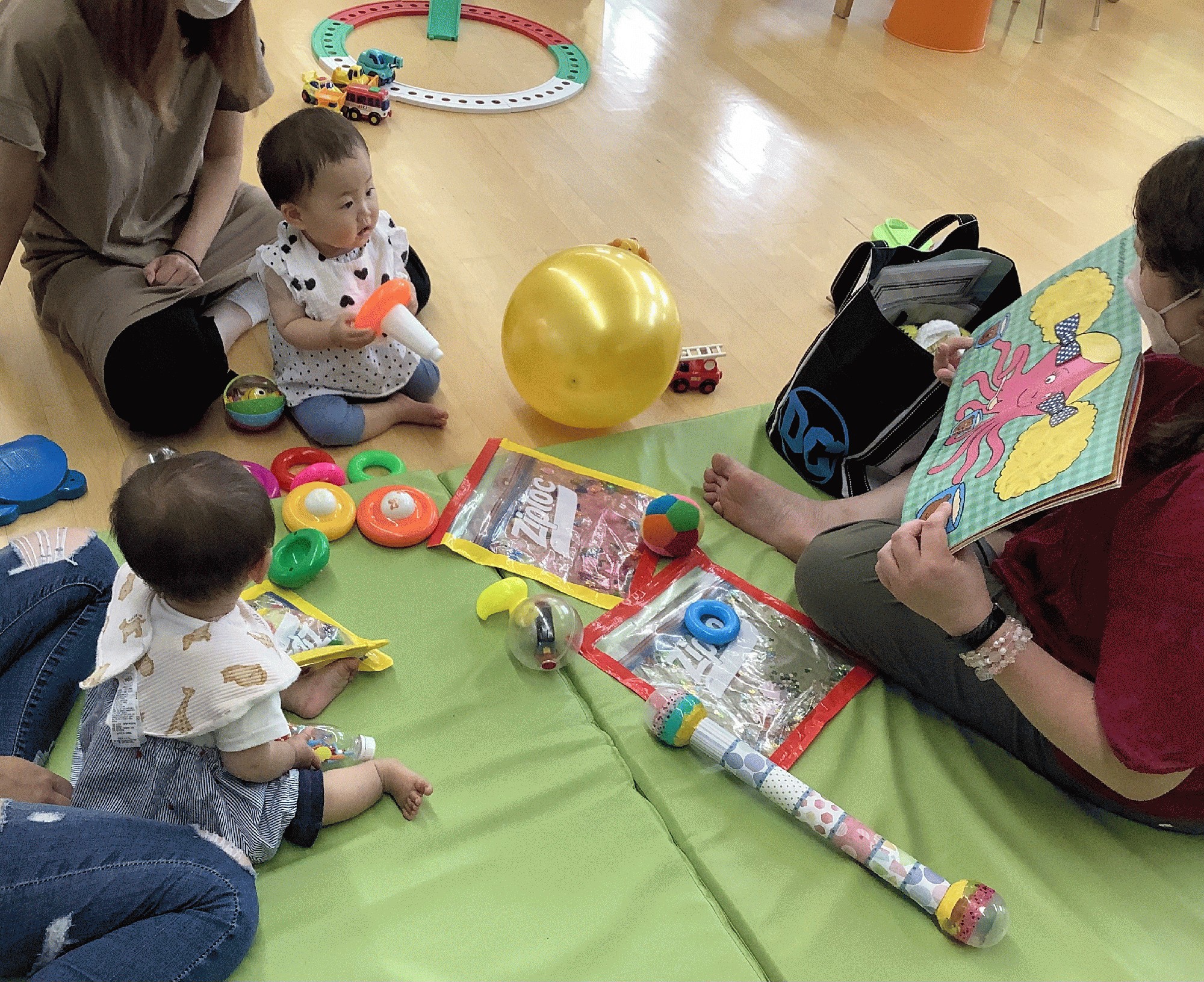 今日は、いろんな色のタコ🐙さんが出てくる絵本を見たあと、身の回りの色の名前を言ったり、♪The wheels on the busや♪ABCsongを歌って遊びました(^^)