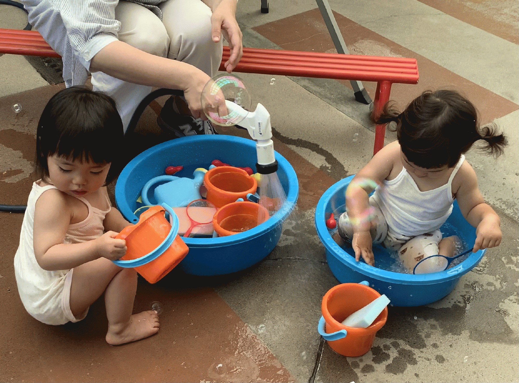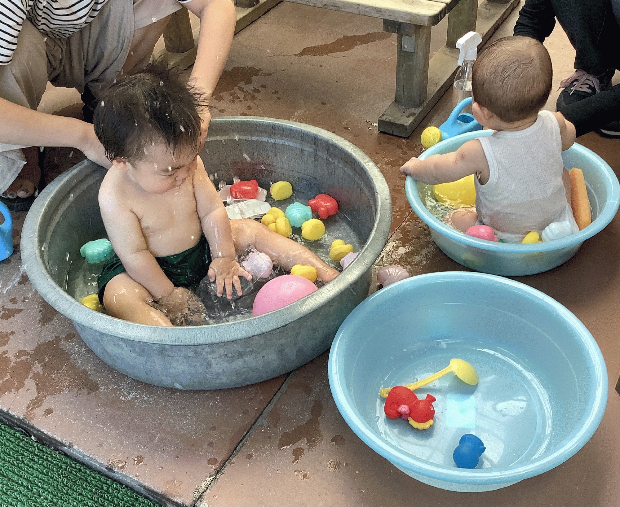 先週出来なかった水遊び。今日はお天気が良すぎるくらいに良かったので、日除けを立ててみんなで遊びました。おもちゃを入れて掬ったり、コップやバケツに入れたり流したり…、みんな水から出たくないくらい、楽しかったようです‼︎(*≧∀≦*)
