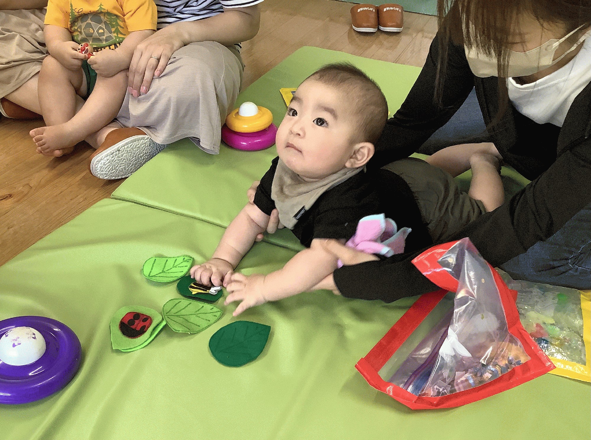 今日は、はらぺこあおむし(The very hungry caterpillar)を見た後、ケイティ先生と葉っぱの下に隠れたてんとう虫🐞やハチ🐝を見つける遊びをしました。フェルトで作った葉っぱをめくると出てくるのが、面白かったですね♪