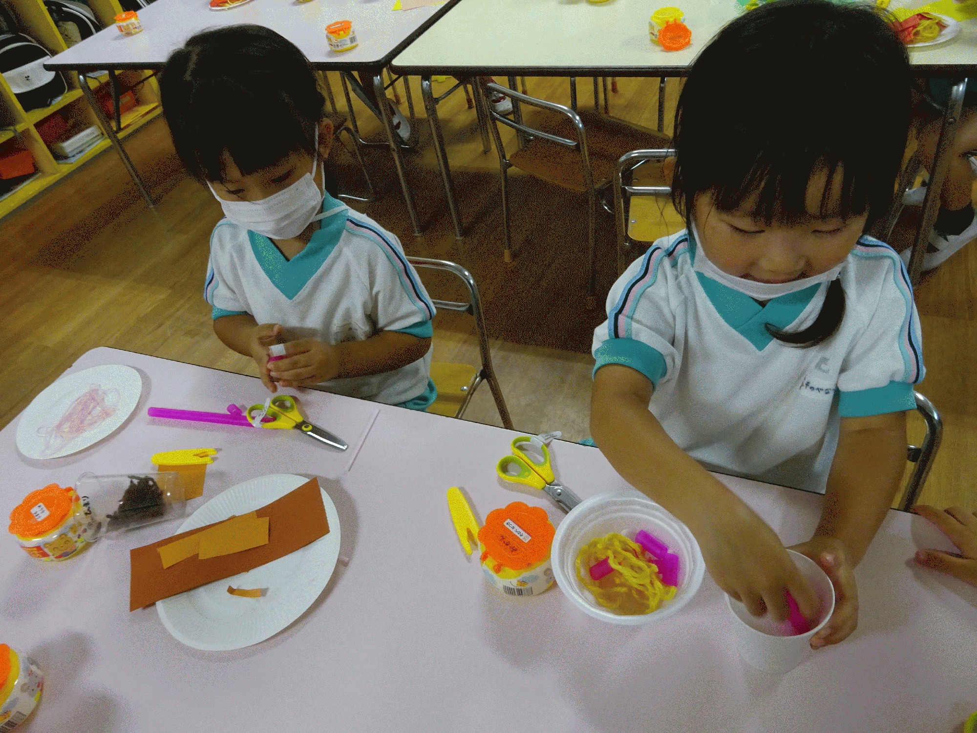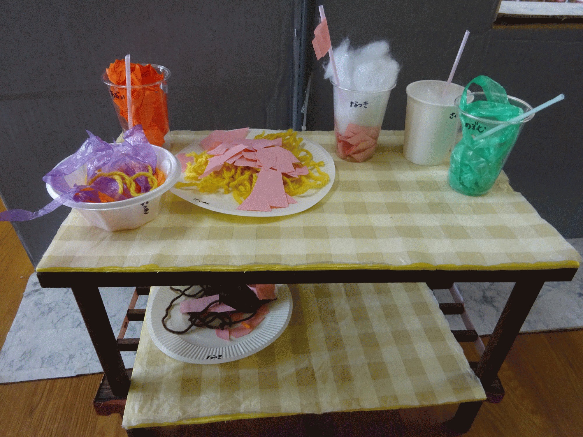 毛糸を入れたり…黄色い毛糸でパスタにしたり、