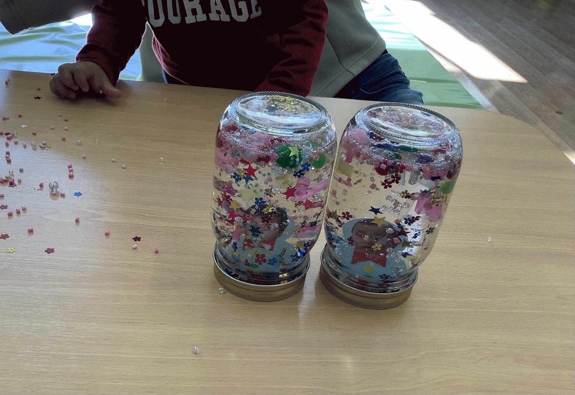 ★今日は、スノードームを作りました。ガラス瓶の中にビーズやスパンコール.細かく切ったストローなど好きな物を入れて、洗濯のりを注げば出来上がり。瓶の蓋に付けたかわいい雪だるまを入れて、中身が溢れないようにビニールテープを巻いたら完成です。たくさん入れたお友だちのスノードームは、とっても賑やかになりました(*≧∀≦*)