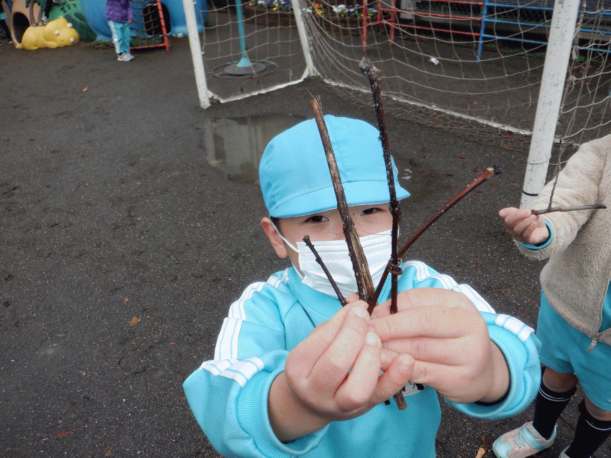 園庭に行って木の枝を拾いに行きました!
