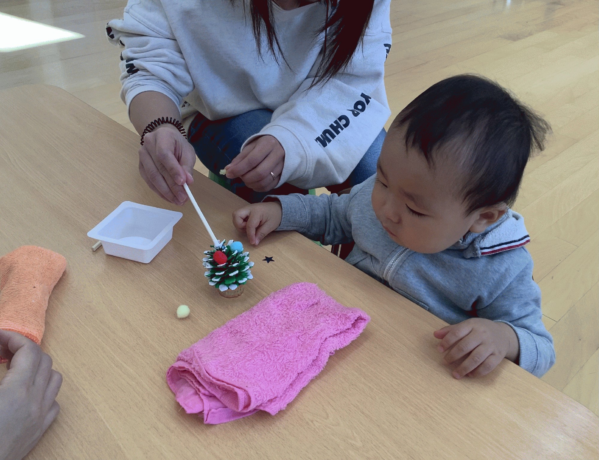 好きな形の松ぼっくりツリーを選んで、割り箸の先につけたボンドで、スパンコールやビーズ.デコレーションボールなどを 好きな場所に飾っていきました。色んな形のビーズやスパンコールに興味津々で、飾るだけでなく 触ったり選り分けたりして楽しんでいました。