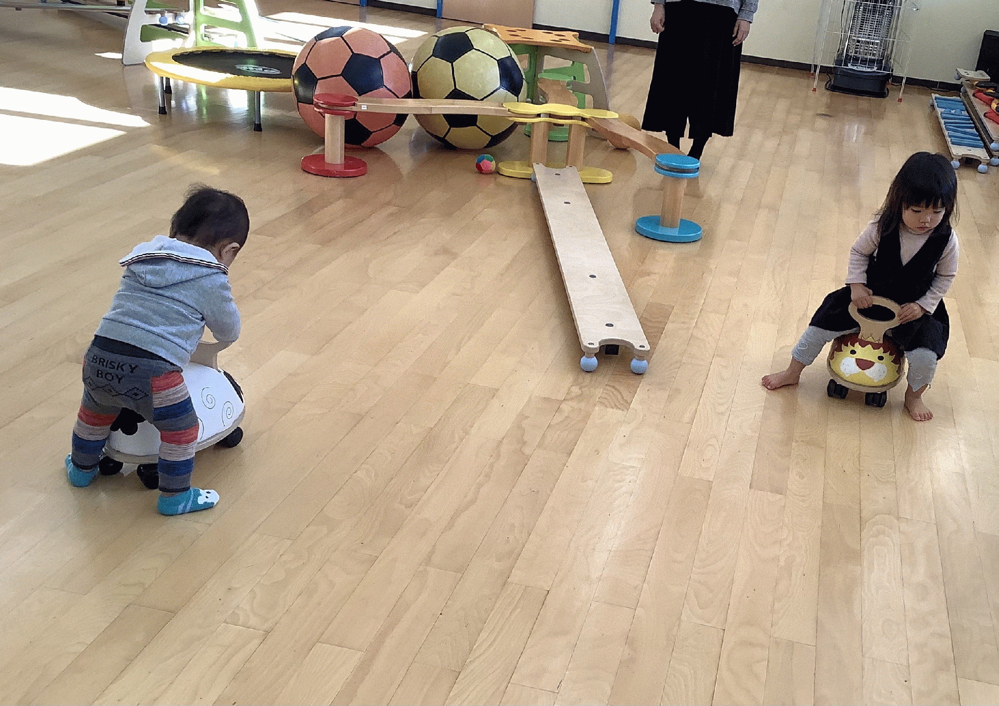 跳び箱からジャンプ.バランスボード.マットのお山登り…それから大きなボールを転がしたり。みんないっぱい体を動かして遊びました(*^^*)