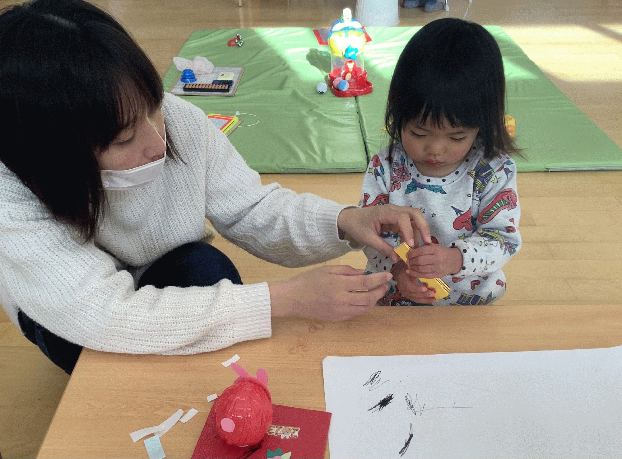 今年の干支はうさぎ。そこで、縁起の良い「うさぎダルマ」を作りました。ウサギの顔は、目玉シールを貼ったり水性マーカーで描いたり…。ママと一緒に、楽しく製作しました(^^)