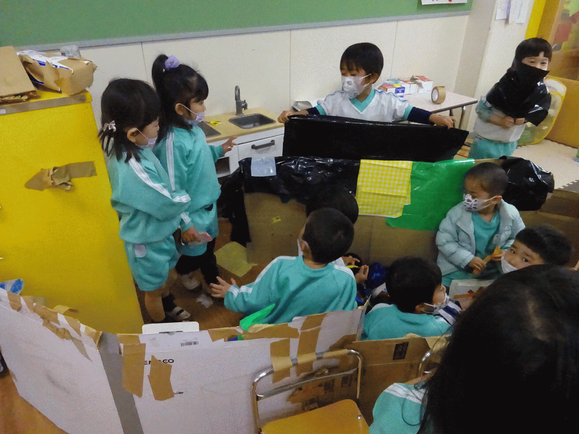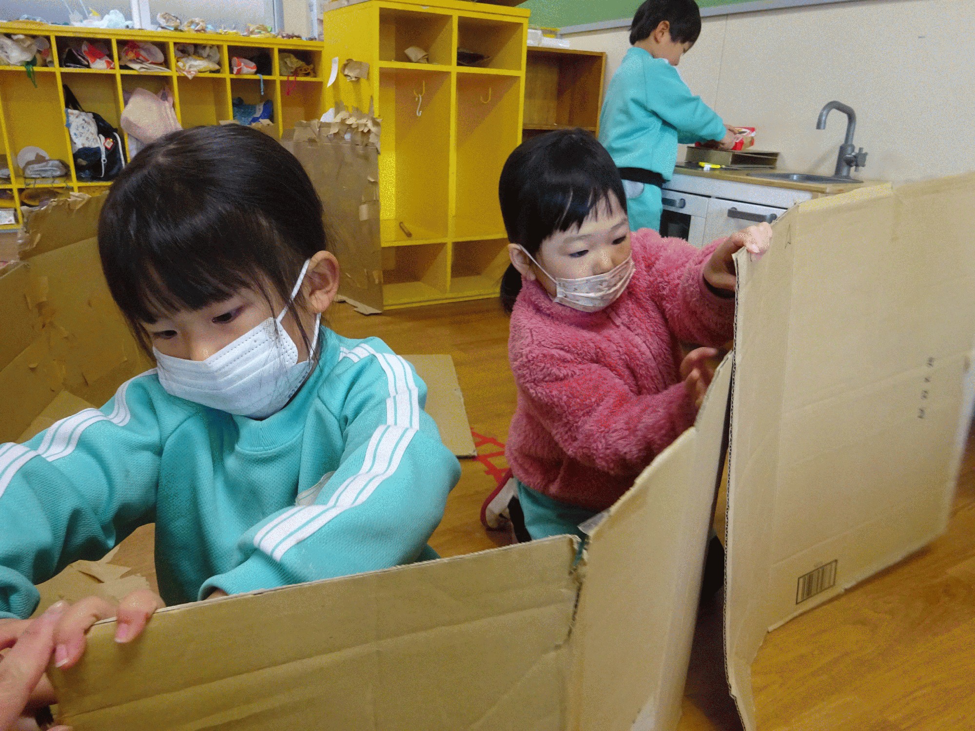 3学期になり製作コーナーが始まりました。最近では廃材の他にダンボールも用意しています。切るのは難しいので手伝ったりしていますが、子どもたちは積極的にガムテープを使いダンボールを繋げています。