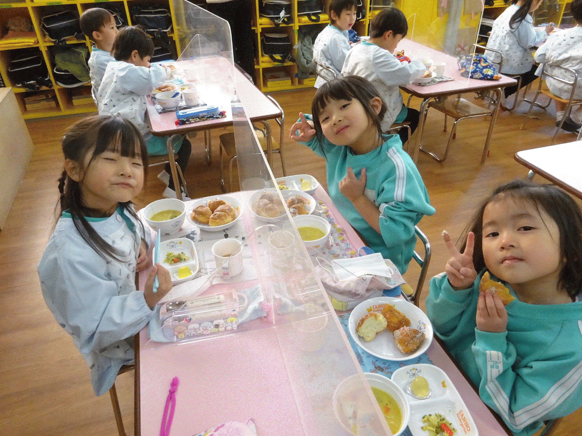 「他のクラスのお友達と一緒に給食食べれるよ。」と