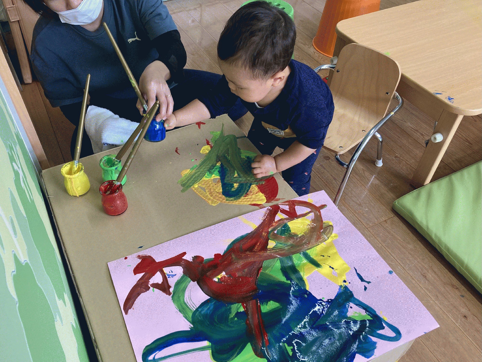 今日は、赤.青.黄色.緑の4色を用意して絵の具でお絵描きを楽しみました。まずは、大きな色画用紙に太筆で!硬めに溶いた絵の具で、ぐりぐり描いていくと 色と色が混ざり合って面白い模様が出来ました♪ それから、大きなダンボール箱に描いてみたり…。