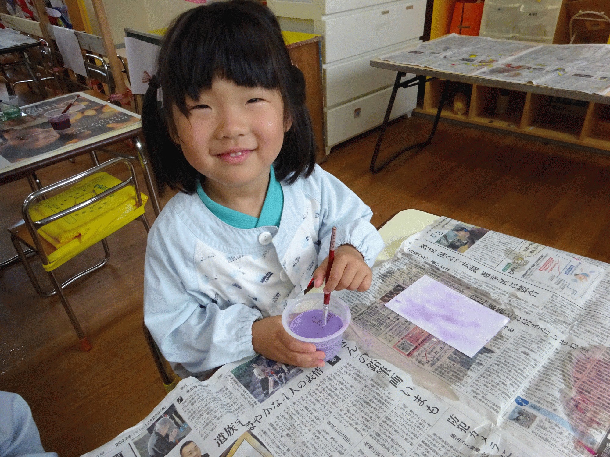 問いかけると声を揃えて「むらさきー!!」