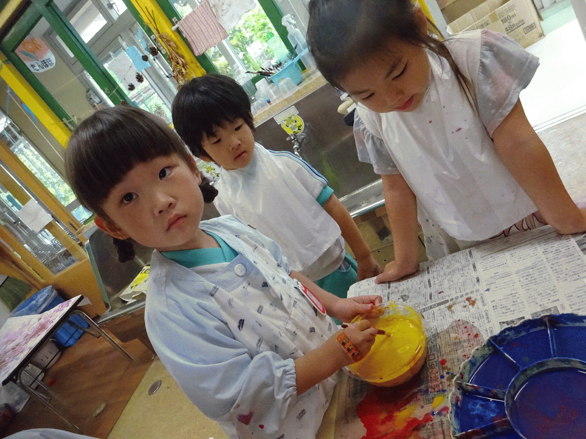 今日は、赤・黄・青・白の絵の具を使い