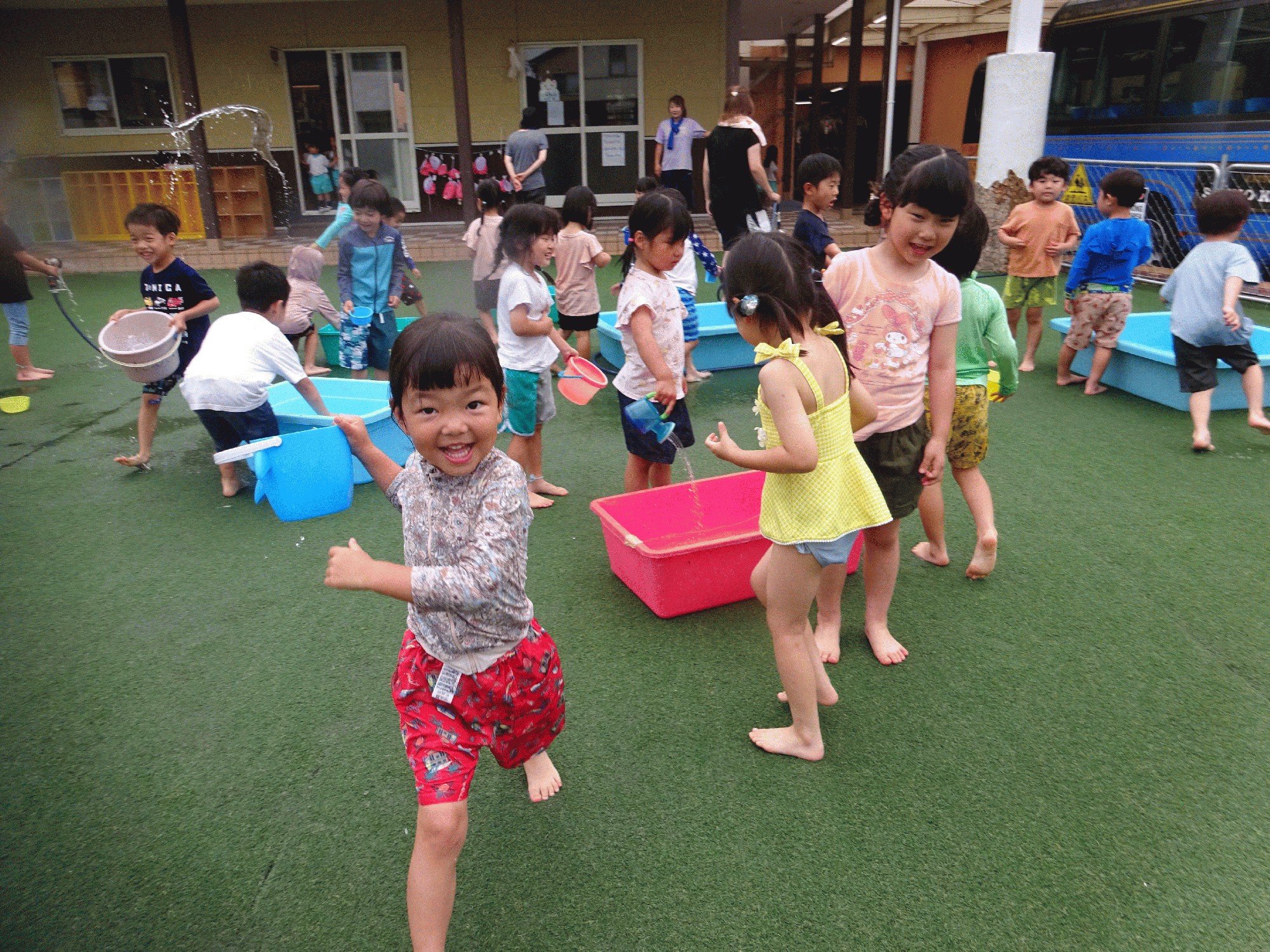 今日は年中になり、初めて水遊びを行いました。