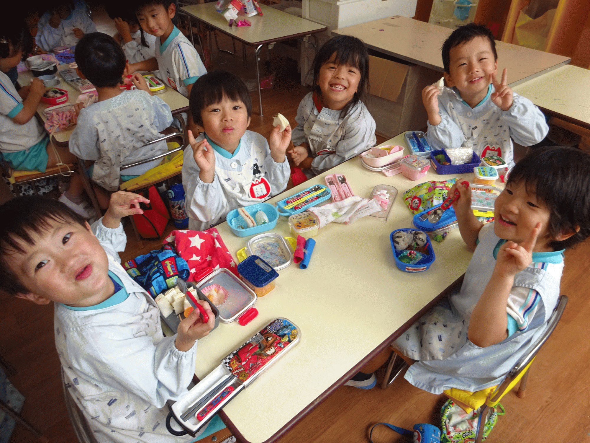 保護者が作ったお弁当を見せ合い、とても美味しそうに食べていました♪