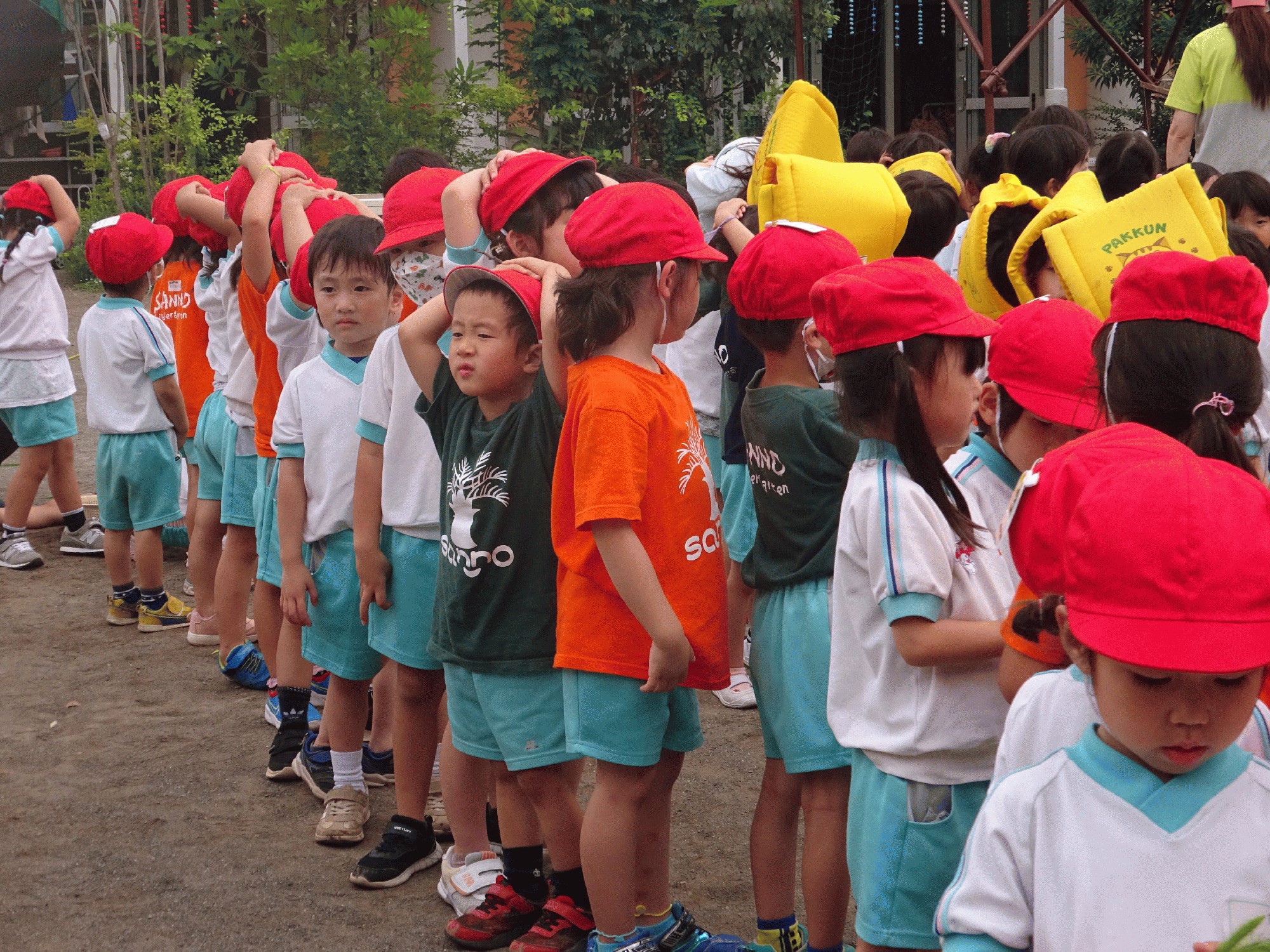 たんぽぽ組は園庭で遊んでいる所からの避難を想定して行いましたが、